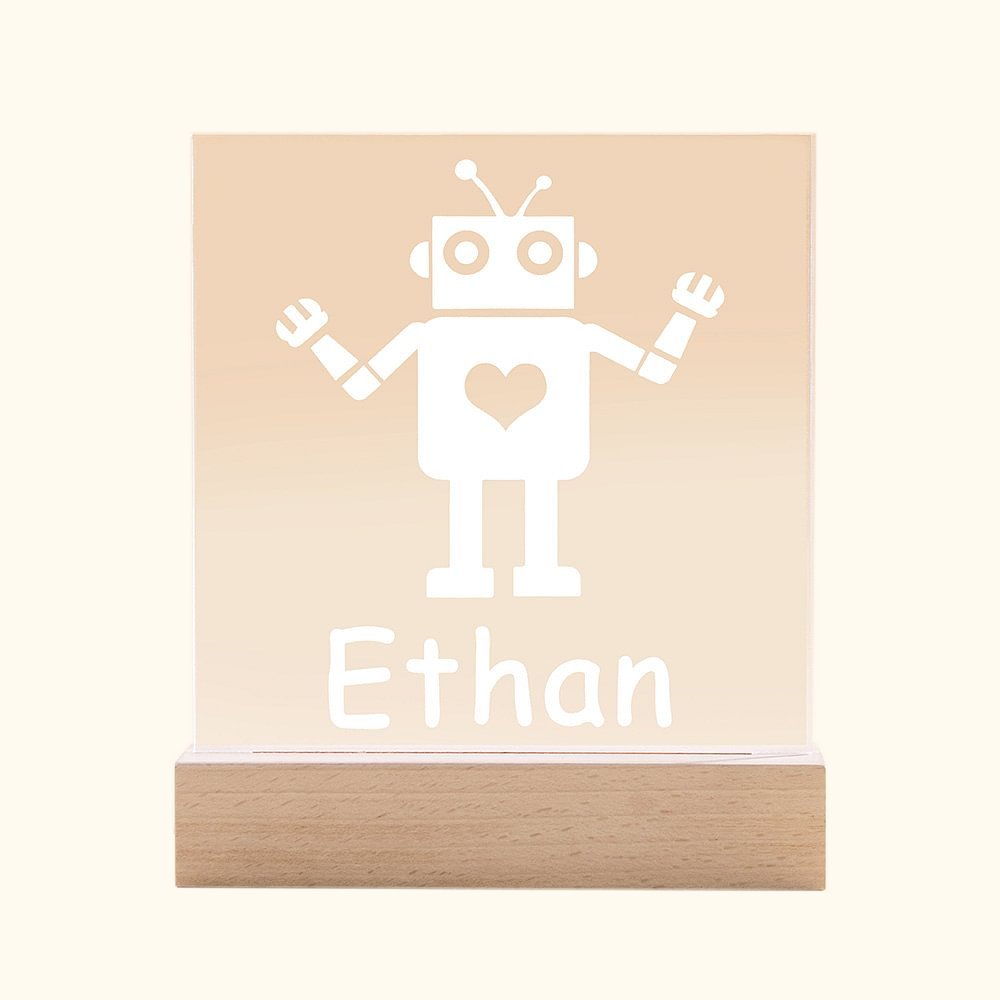 •Deze Callie-nachtlamp is ontworpen als een speciaal cadeau voor kinderen. De robot erop zorgt voor een levendige uitstraling en een leuke omgeving voor de kindernacht. Het graveren van de naam van het kind op de lamp voegt een unieke toon toe aan de zoete droom, te beginnen met de warme lamp. Geschikt voor kinderen die fans zijn van robots of nerds. Als het donker wordt, wordt de naam van uw partner verlicht met deze lieve lamp. •Als woondecoratie verwarmt het de momenten die u met uw kinderen doorbrengt. En overdag staat het ook nog eens prachtig in je huis. Door het duurzame perspex materiaal hoef je niet bang te zijn dat het kapot gaat. Staat stabiel door de houten basis.