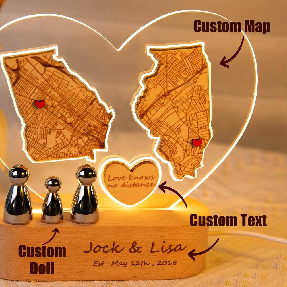 De houten laser beeldhouwt de straat op de achtergrond en toont liefdevol de locatie van jullie twee. 'S Nachts de lichten aandoen is ook een heel romantische uitdrukking. Zelfs als twee mensen ver van elkaar verwijderd zijn, kunnen ze elkaar nog steeds missen. • Aanpasbaar: eenvoudige en schattige poppen kunnen worden aangepast aan uw gezinssituatie. Het maakt niet uit of u een gezin met meerdere personen bent, wij kunnen het voor u op maat maken. •Perfect cadeau: op een jubileum of speciale dag zal het geven van dit cadeau met een speciale betekenis voor haar zeker een mooie herinnering creëren. • Duidelijke gravure: de houten basis is stabiel en gemaakt van hoogwaardig beukenhout. Lasergraveer uw gepersonaliseerde tekst, helder en schoon, met schattige lettertypen. •Zacht licht: het licht is zacht, zeer geschikt om een nachtlampje van te maken, 's avonds een romantische halo af te geven en warmte en liefde aan uw huis toe te voegen.