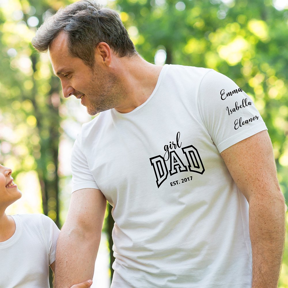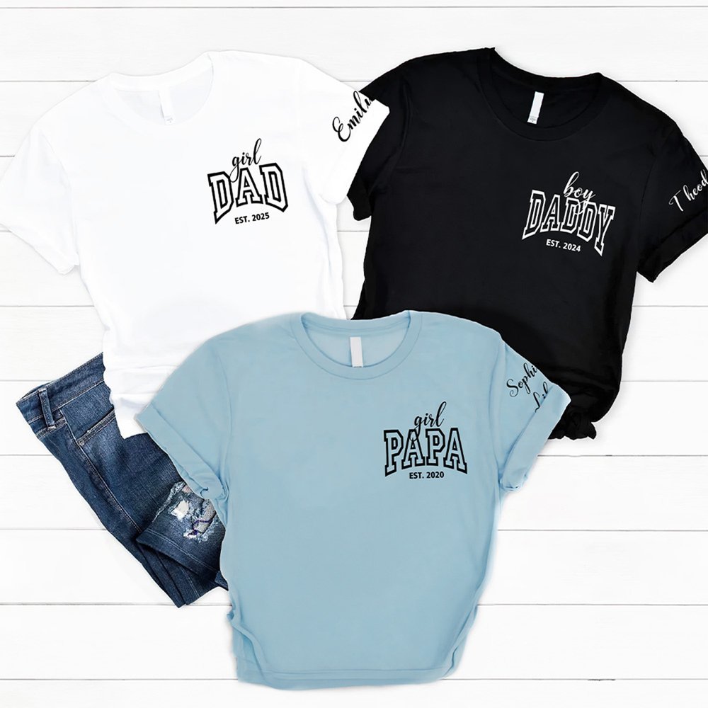 Dit aangepaste T-shirt heeft een strak, minimalistisch ontwerp met een vette, aanpasbare titel op de voorkant in combinatie met het geboortejaar van het kind. De linkermouw kan worden gepersonaliseerd met de naam van het kind, met ondersteuning voor maximaal zes namen. Deze attente details vieren in stilte de rol en liefde van een vader of opa. Verkrijgbaar in verschillende kleuren zoals zwart, wit, blauw en grijs. Een gestroomlijnde, veelzijdige pasvorm die ingetogen maar toch persoonlijk aanvoelt - perfect om elke dag te dragen en een stille uiting van liefde.