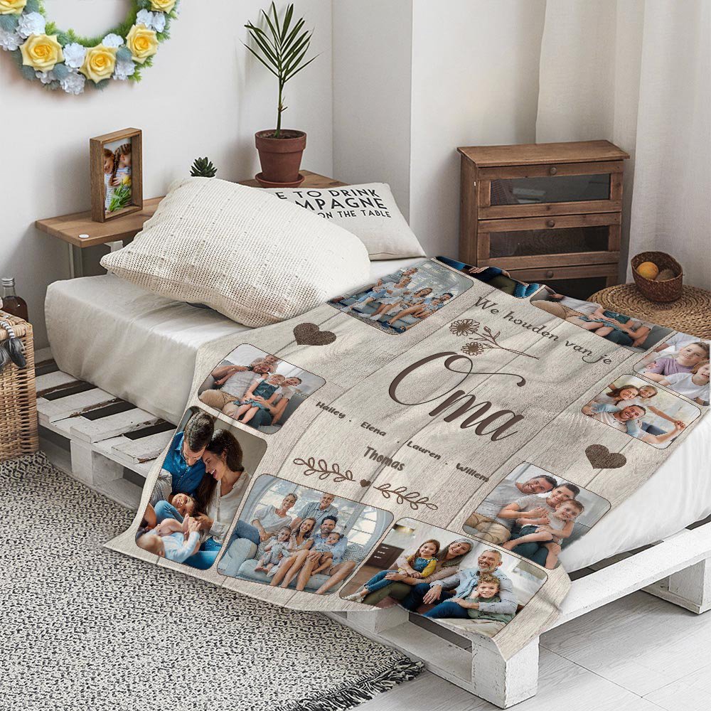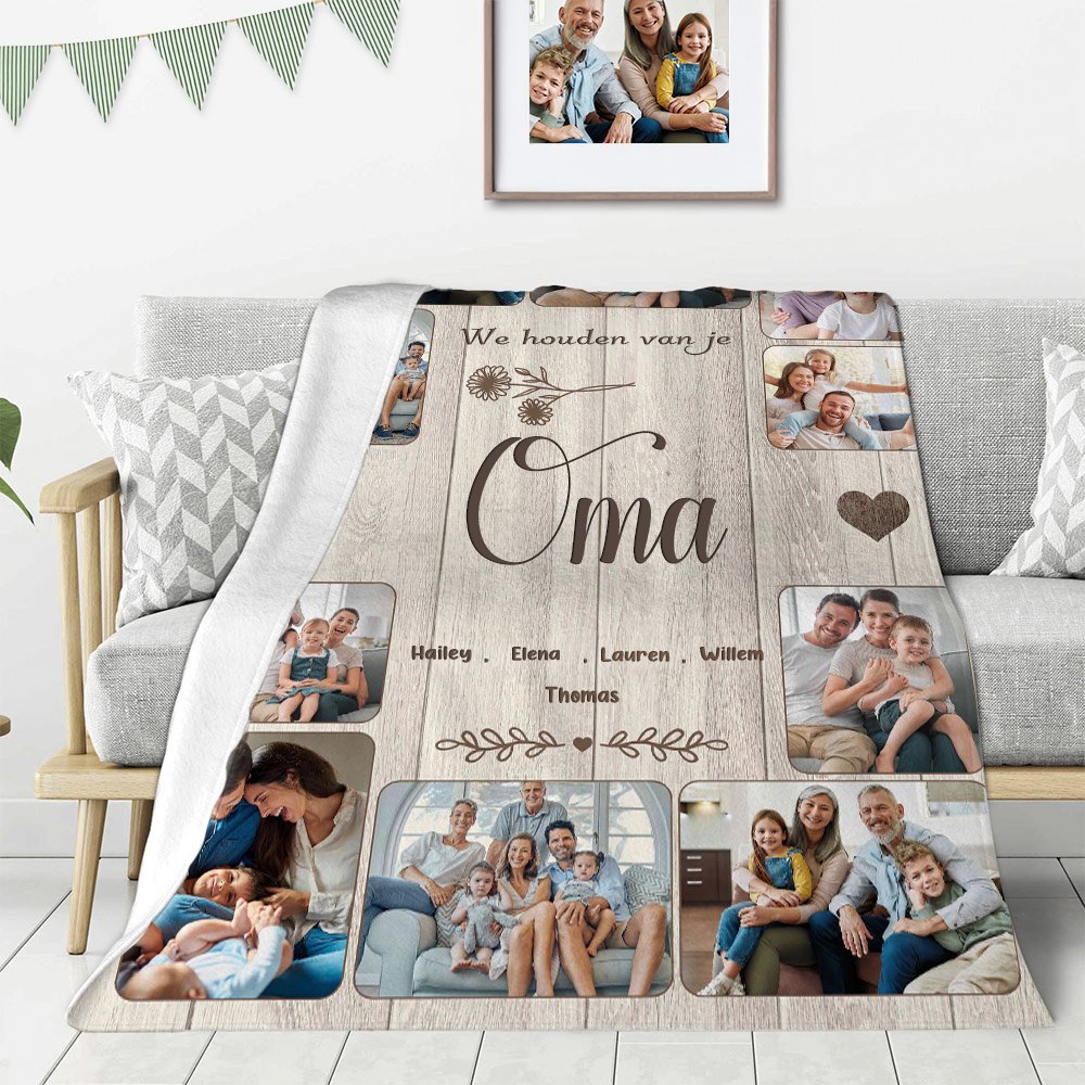 Vier de diepe en liefdevolle band tussen generaties met de deken. Upload tot 10 familiefoto's en 1-8 namen om een ontroerende collage te maken. Elke afbeelding die op deze deken wordt gedrukt, is een herinnering aan onvergetelijke momenten en de warmte van familie.