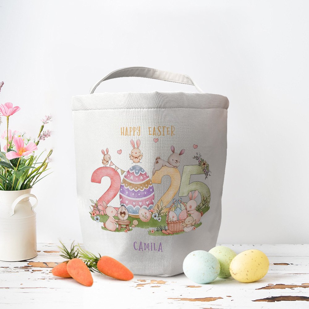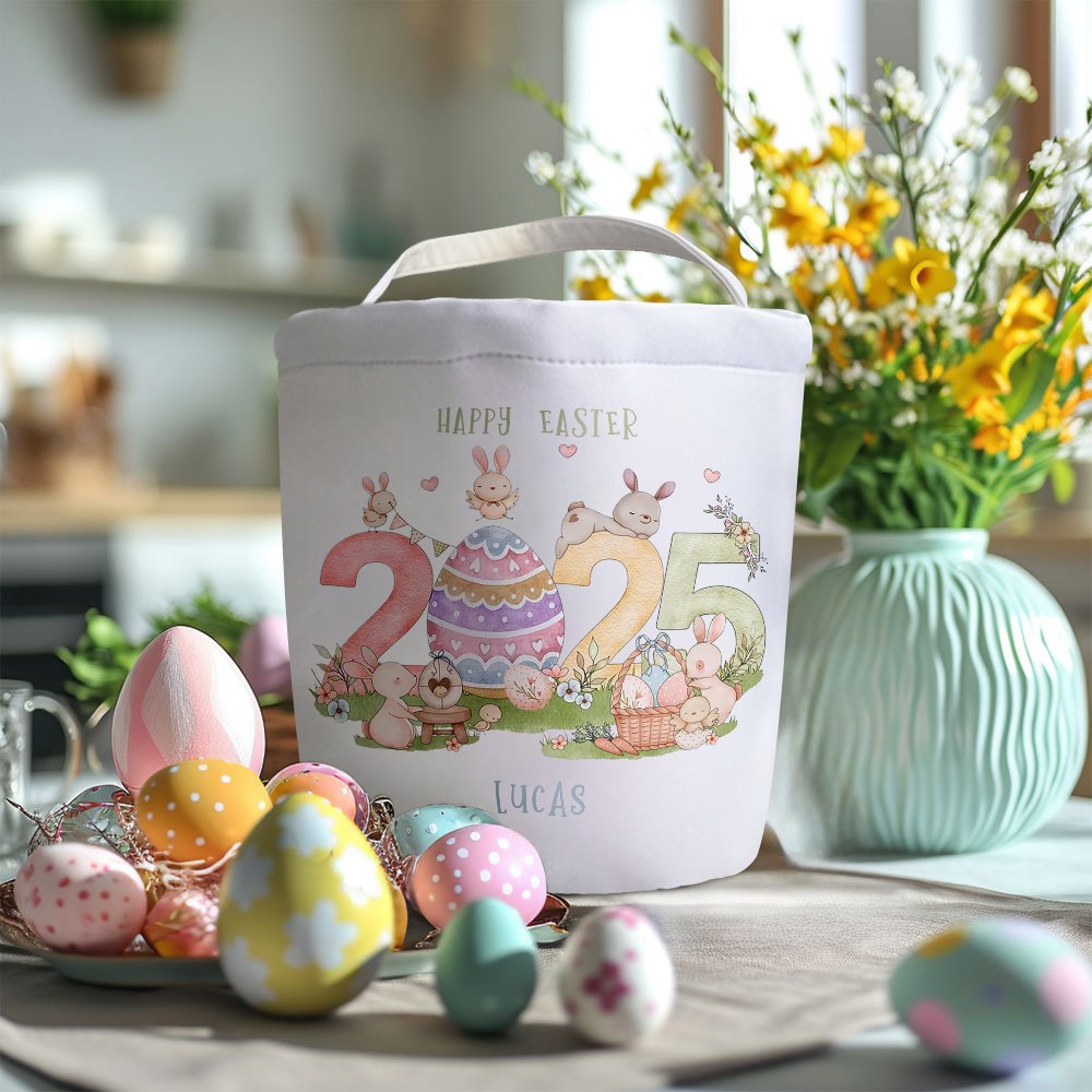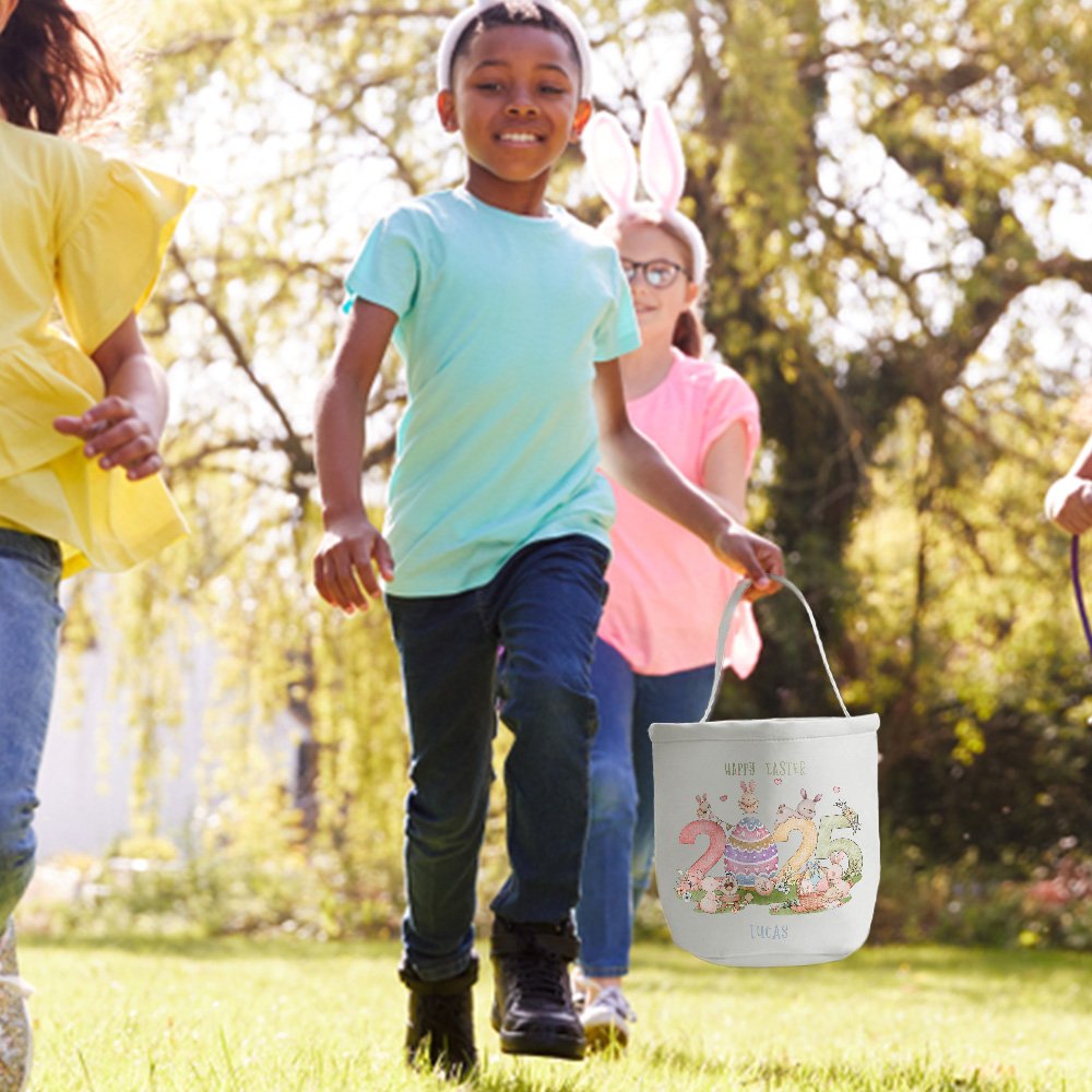 Het mandontwerp is gevuld met feestelijke vrolijkheid. Het heeft een puur witte basis met levendige en schattige paashazen en kleurrijke paaseieren. De mand kan ook worden aangepast met de naam van het kind. Dit ontwerp draagt niet alleen bij aan het paasplezier, maar maakt elke mand ook uniek.