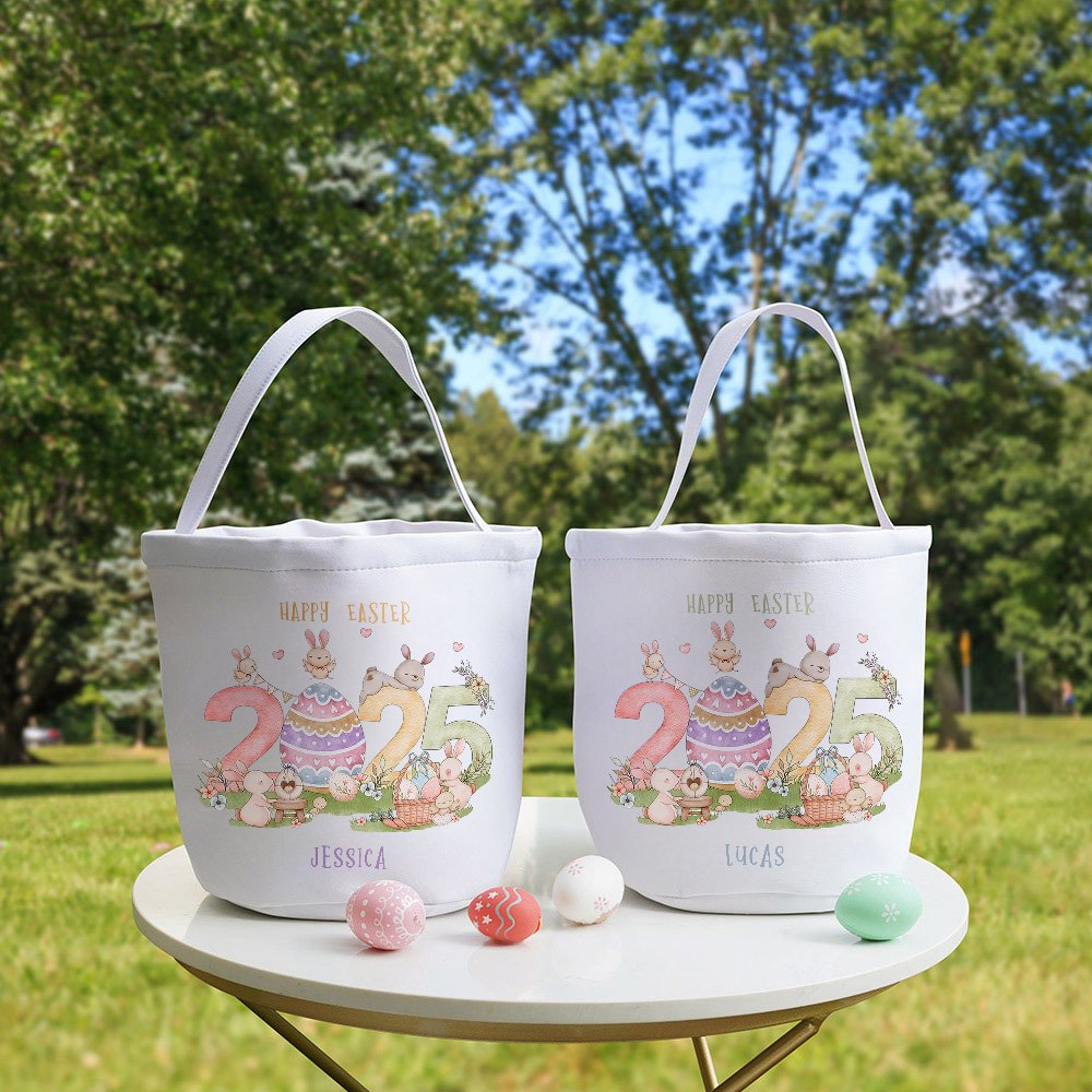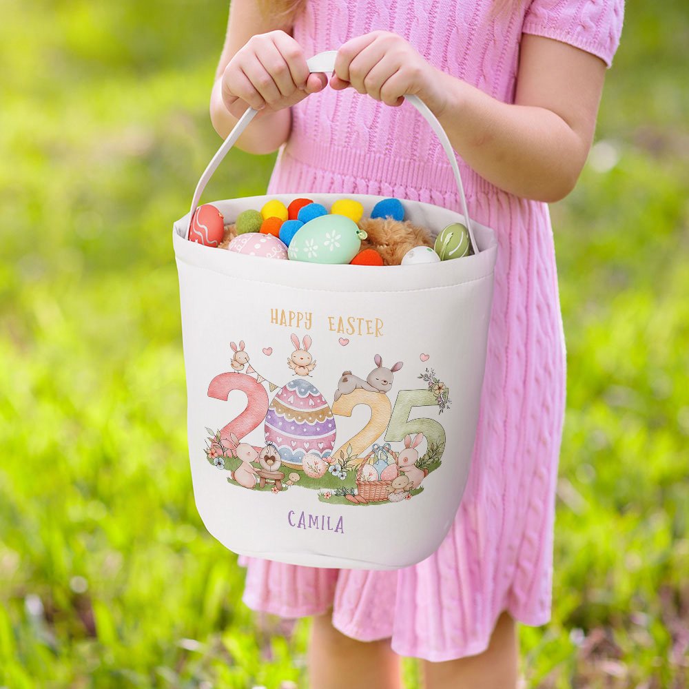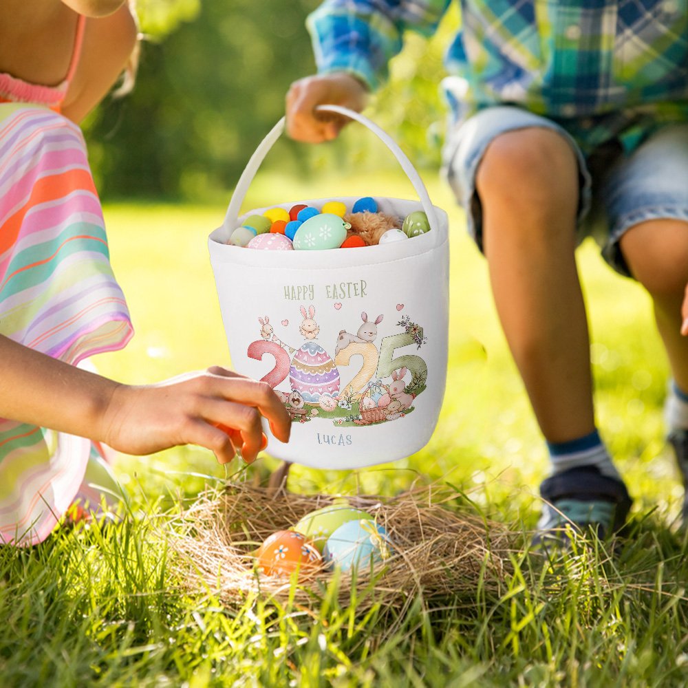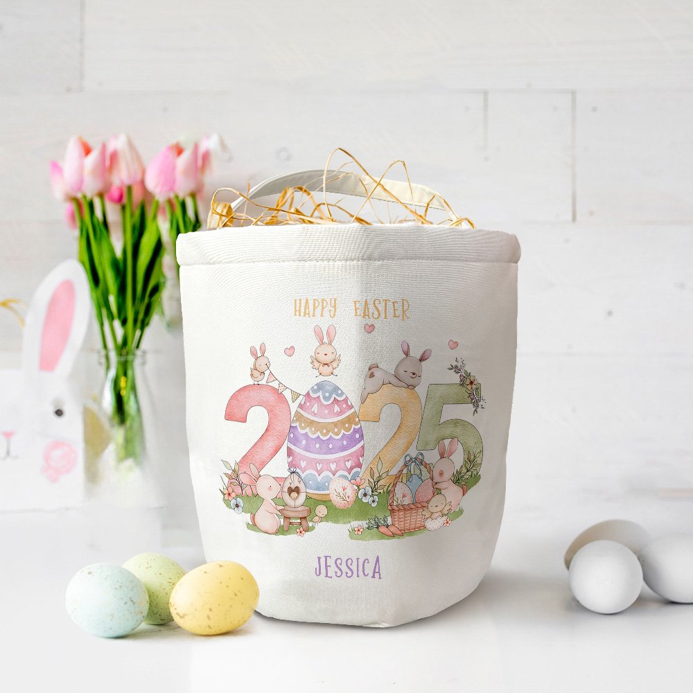 Het mandontwerp is gevuld met feestelijke vrolijkheid. Het heeft een puur witte basis met levendige en schattige paashazen en kleurrijke paaseieren. De mand kan ook worden aangepast met de naam van het kind. Dit ontwerp draagt niet alleen bij aan het paasplezier, maar maakt elke mand ook uniek.
