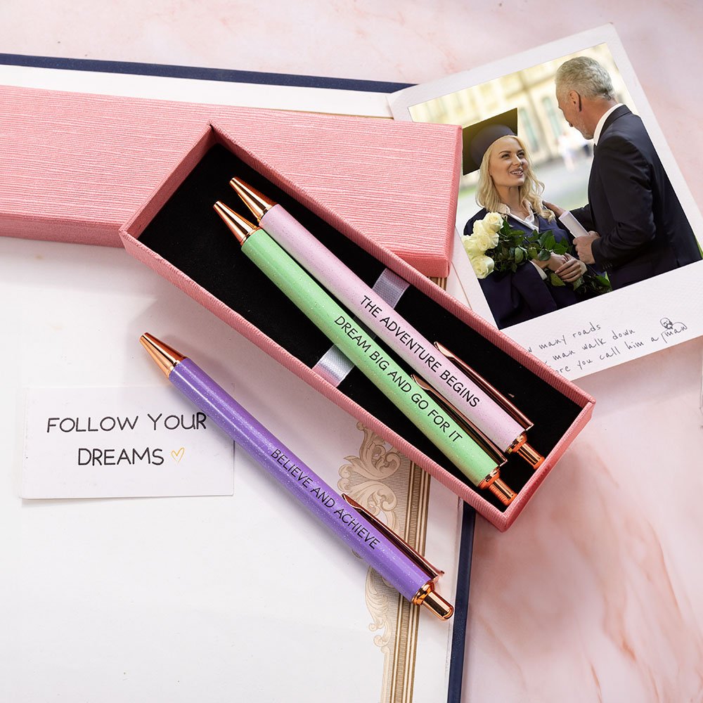 Elke pen in deze schrijfset heeft zijn eigen elegante kleur en is voorzien van een opbeurende zin die is ontworpen om de gebruiker aan te moedigen tijdens hun dagelijkse werkdag en een vleugje plezier toe te voegen aan hun schrijven. Met de personalisatieopties kun je je motiverende boodschap aanpassen, waardoor deze set een uniek accessoire is voor elk bureau.