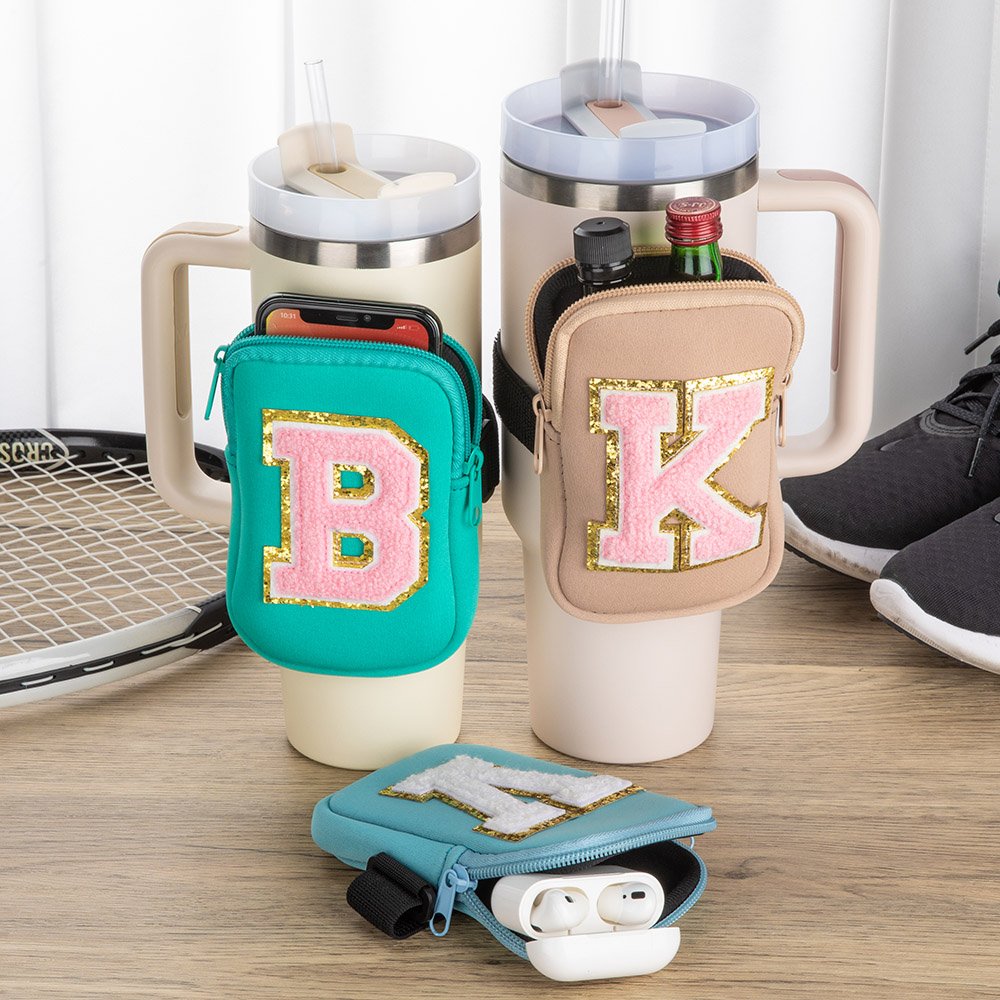 Met zwart verstelbaar klittenband dat stevig aan je beker vastzit en niet verschuift. Er past met gemak een 30oz of een 40oz beker in (je kunt zelf instellen hoe strak de band om de zijkanten zit, je hoeft alleen maar de band aan te trekken om hem op de fles vast te zetten). Twee ritsen sluiten het zakje veilig af om je spullen in op te bergen.