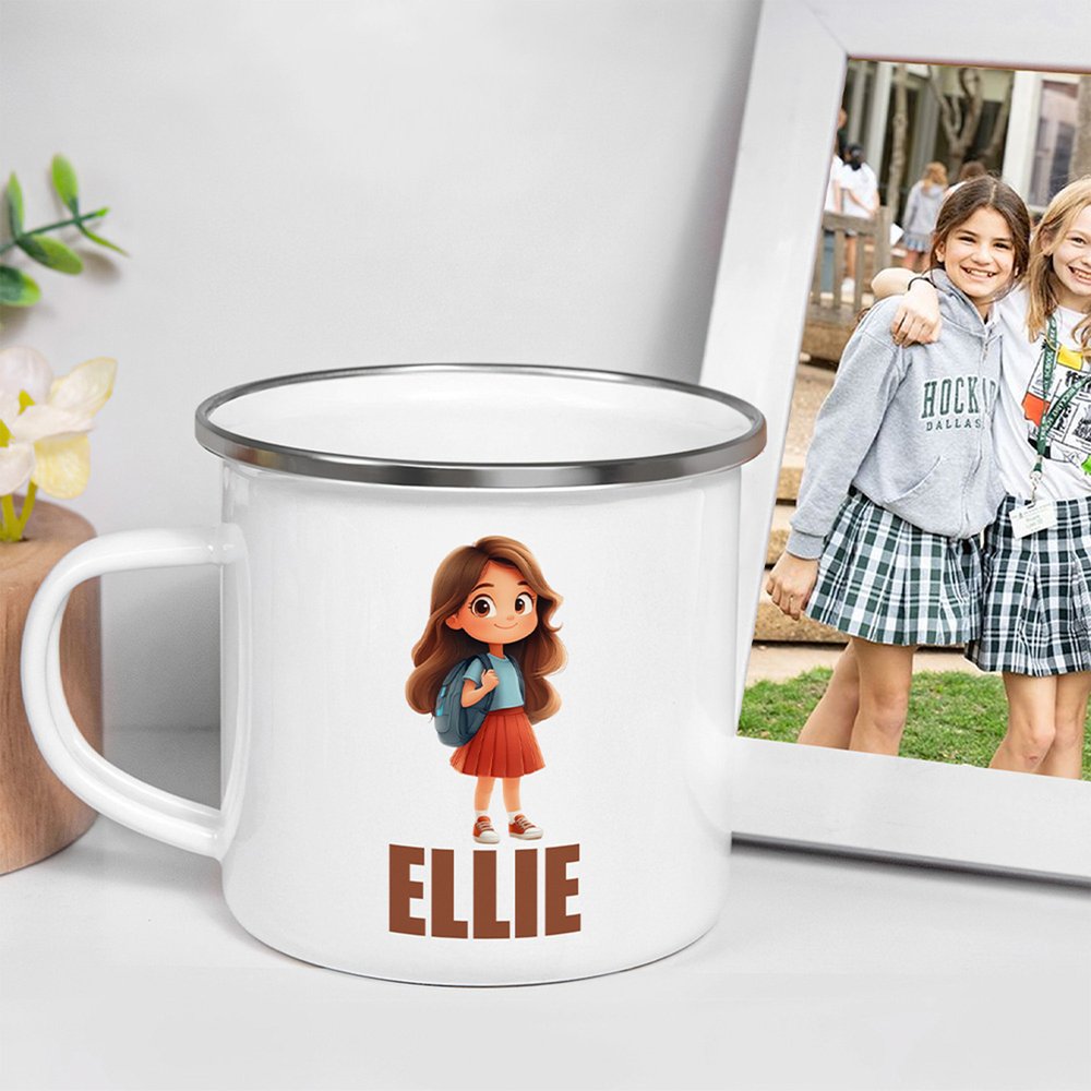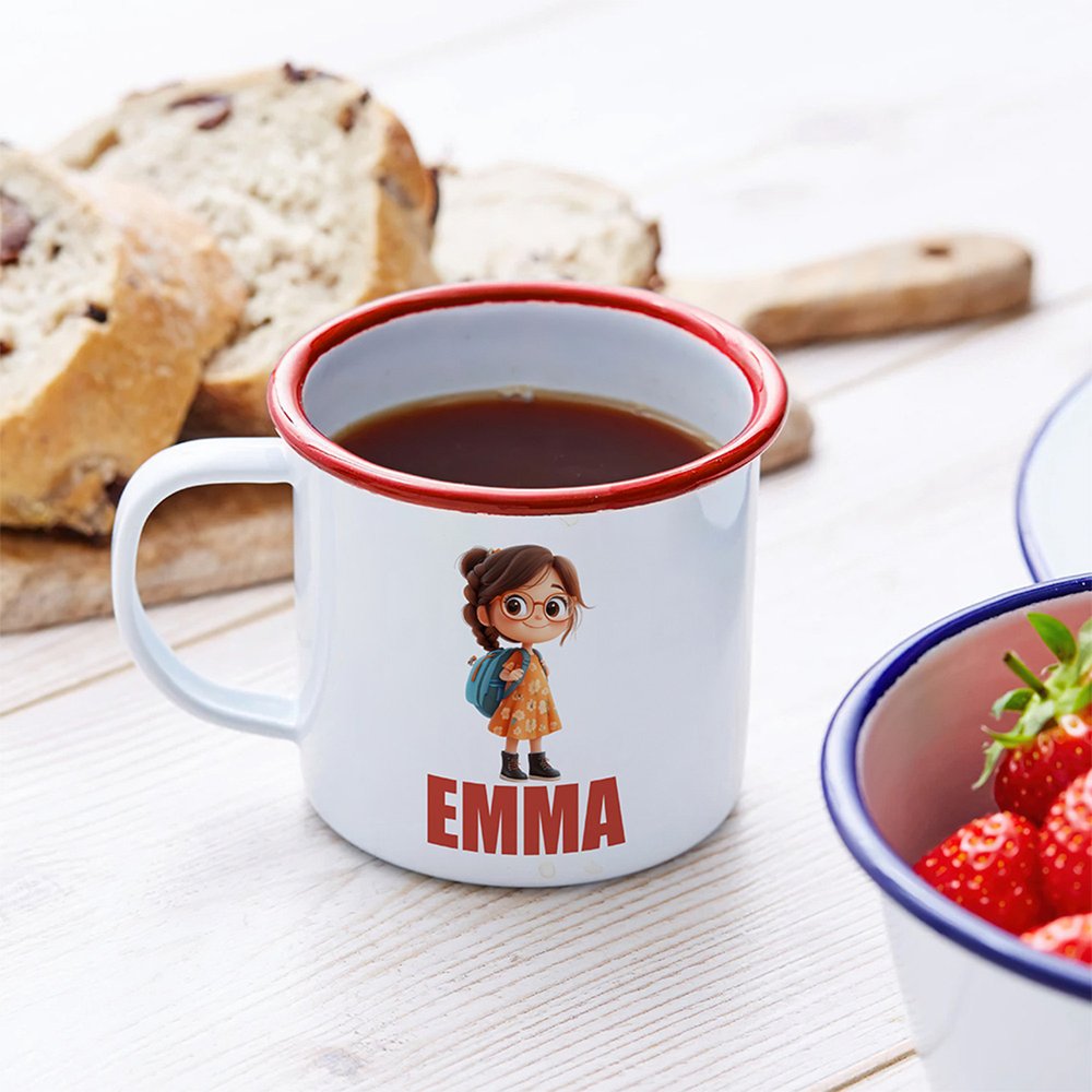 Onze geëmailleerde mokken zijn voorzien van vrolijke en levensechte 3D-stripfiguren. De kindjes dragen schooltasjes en beelden verschillende schattige schoolscènes uit. U kunt de naam van uw (klein)kind toevoegen en kiezen uit 13 letterkleuren om zo een unieke en persoonlijke mok te creëren.