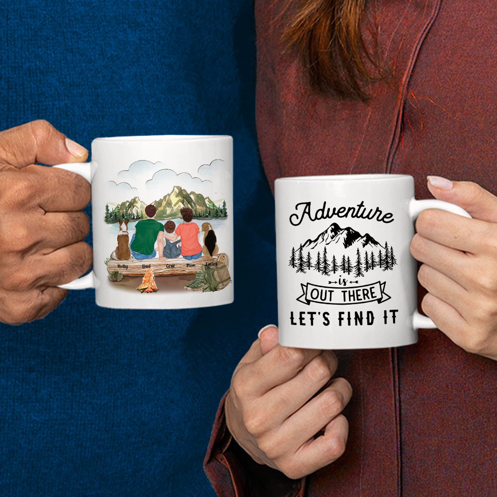 De mokken zijn bedrukt met de woorden "Adventure Is Out There Let's Find It" met een hartverwarmende afbeelding van de familie in de vrije natuur. Je kunt een unieke mok maken door de outfit van het personage en het ras van je harige vriend aan te passen.