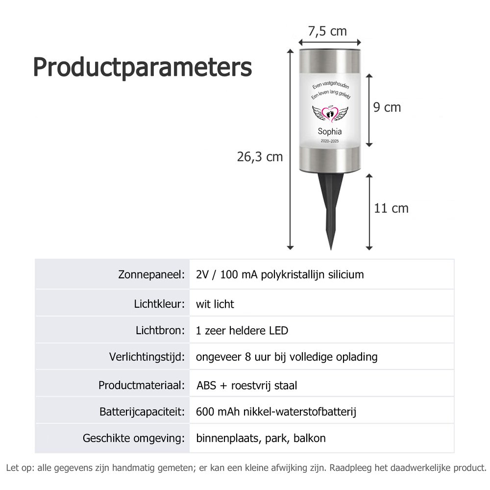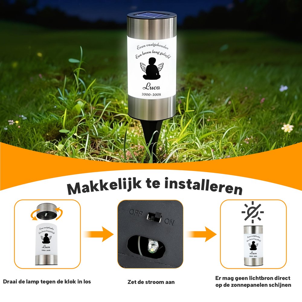 Deze solar tuinlamp is met zorg ontworpen en heeft een bijzondere betekenis. De lamp is verkrijgbaar in verschillende ontwerpen, zoals engelenbaby’s, jongens, meisjes, mannen en vrouwen. Zo kun je een stijl kiezen die past bij jouw herinnering. Je kunt een naam en overlijdensdatum toevoegen om dit gedenkteken echt persoonlijk en uniek te maken. Elk detail is met zorg vormgegeven en helpt om een dierbare op een mooie manier te herinneren. De lamp brengt rust en een gevoel van troost in moeilijke momenten.