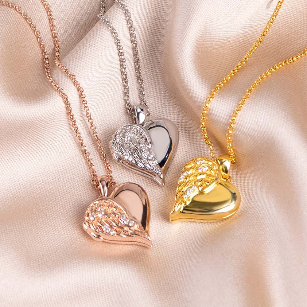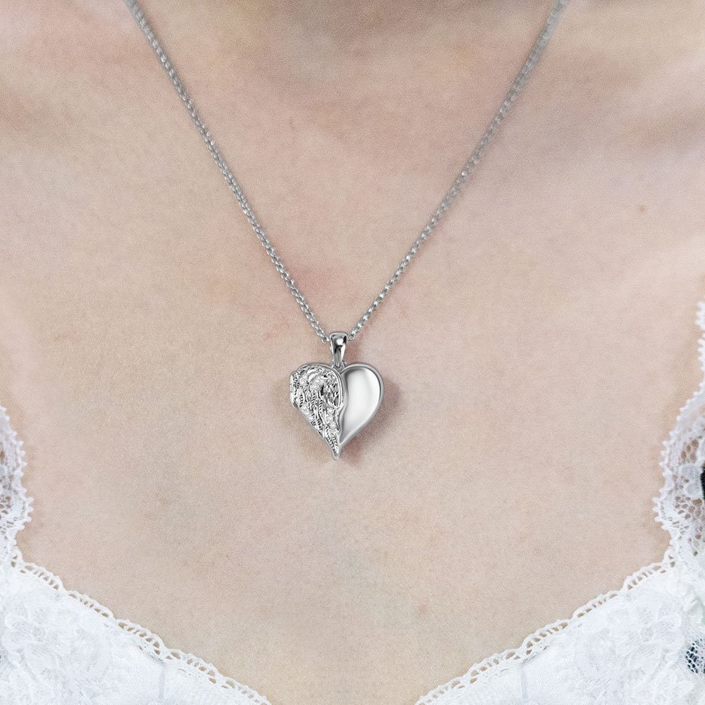Dit medaillon is een prachtig sieraad met een hartvormig uiterlijk. Een persoonlijke gravure van de tekst bevindt zich aan de onderkant van het medaillon, dat geopend kan worden om unieke foto's te onthullen. Dit medaillon met engelenvleugels is de perfecte aanvulling op je sieradencollectie.