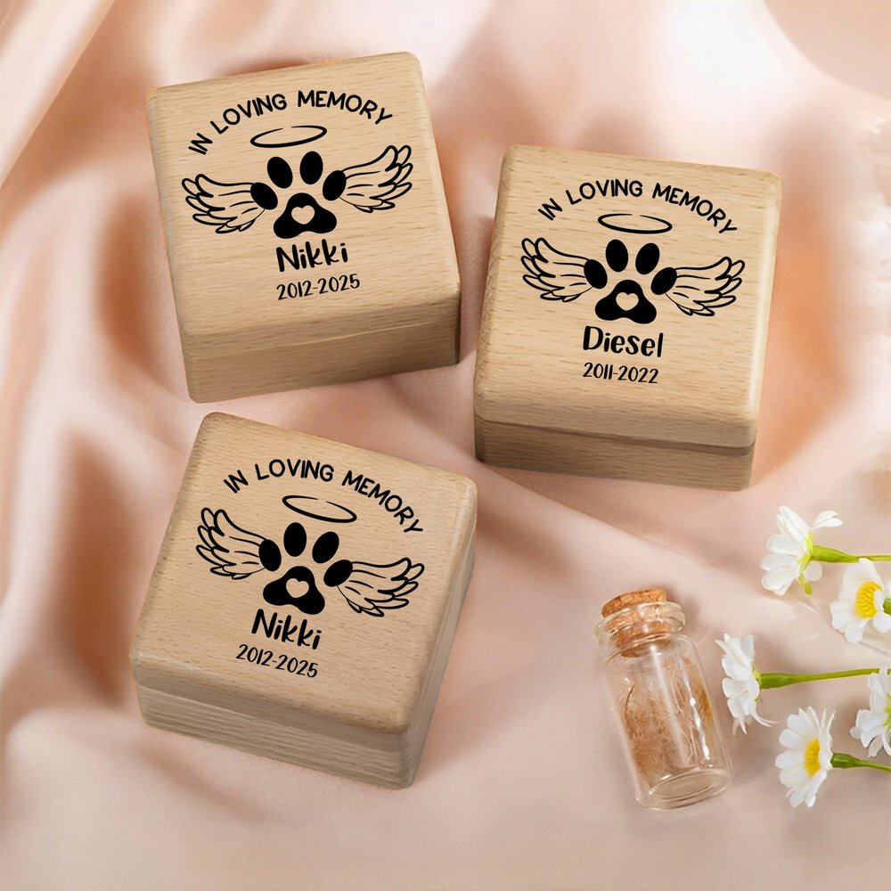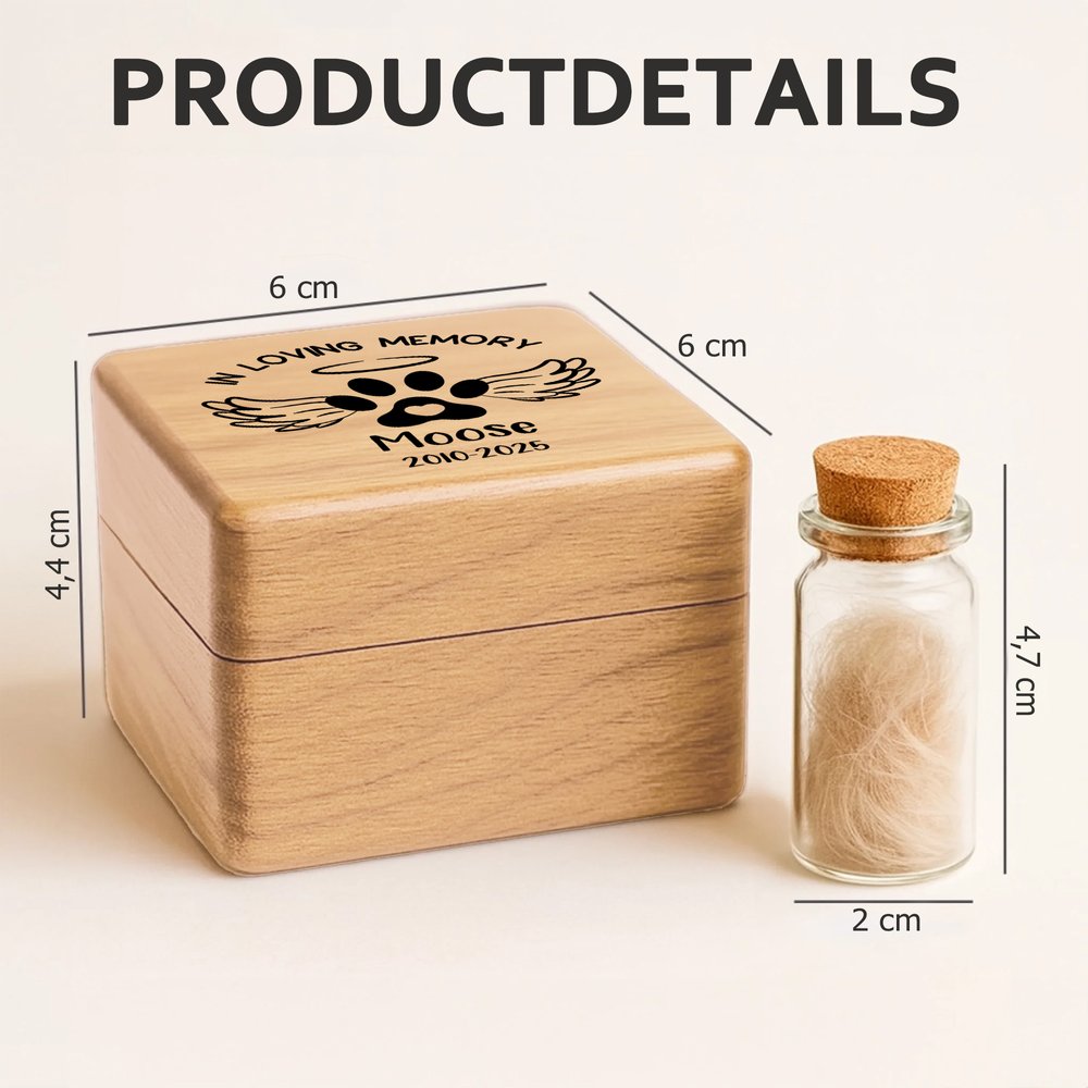 Met pootafdrukken en vleugels als symbolische details, gecombineerd met de naam van je huisdier, foto’s en belangrijke jaartallen, straalt dit ontwerp warmte, respect en herinnering uit. Het biedt huisdiereigenaren een liefdevolle plek om dierbare momenten te bewaren en geeft deze herinneringsdoos een diepe emotionele betekenis.