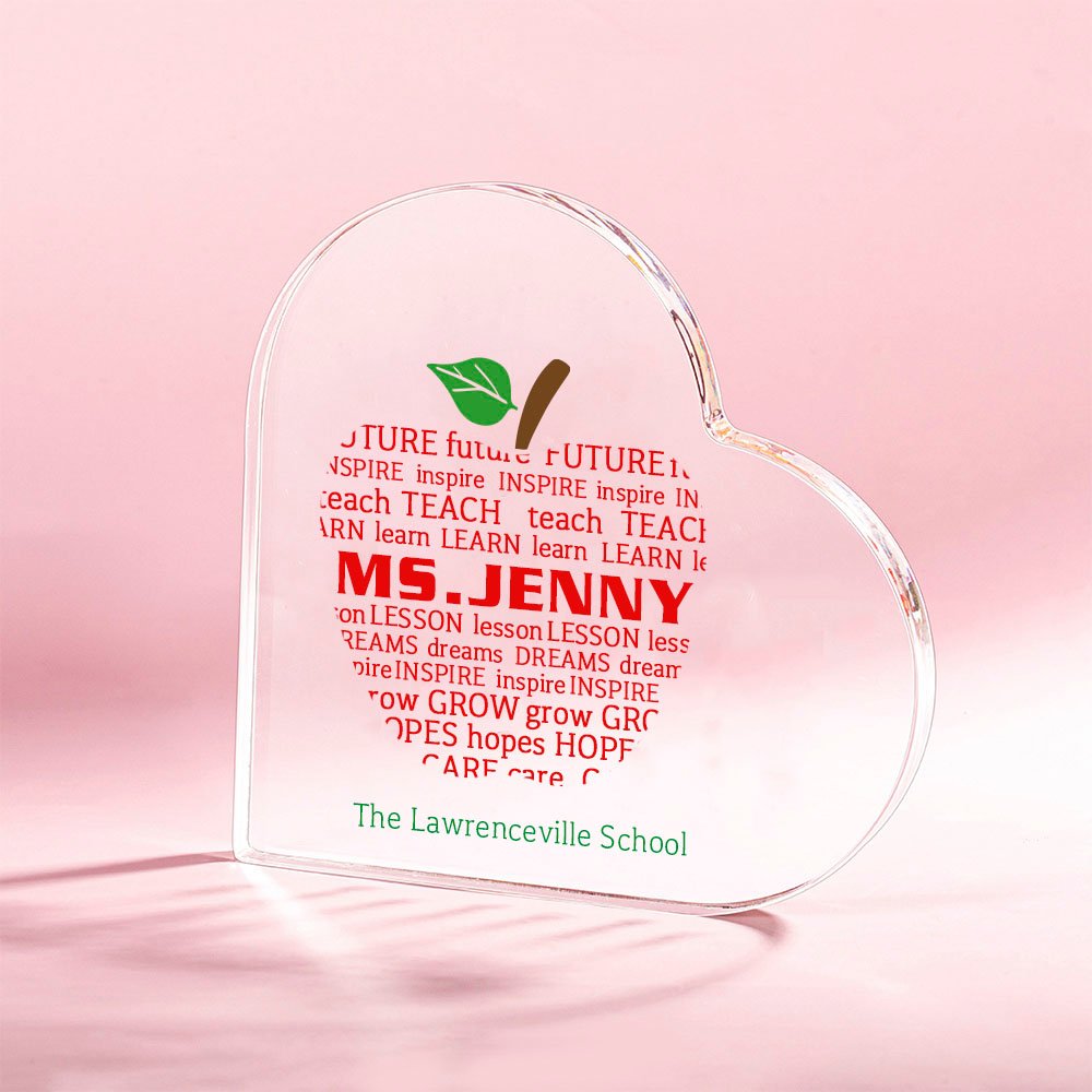 Deze plaquette heeft een unieke hartvorm met een appelpatroon op het oppervlak, wat de liefde en zorg symboliseert die leraren in het onderwijs van hun leerlingen steken. Met de mogelijkheid om het ontwerp aan te passen, kunt u de naam van uw leraar en een welgemeende boodschap toevoegen om een echt uniek cadeau te creëren.
