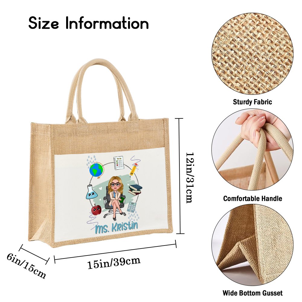 Deze jute draagtas is geïnspireerd op het dagelijkse lesgeven door leraren. Hij is ontworpen met schattige en educatieve cartoonfiguurpatronen en wordt gecombineerd met rijke onderwijselementen zoals boeken, potloden, wereldbollen, enzovoort, wat mensen meteen dichter bij het onderwijs brengt. Het aanpasbare naamontwerp is niet alleen praktisch maar heeft ook een gevoel van exclusiviteit, waardoor elke leraar zijn of haar unieke glorie kan voelen.