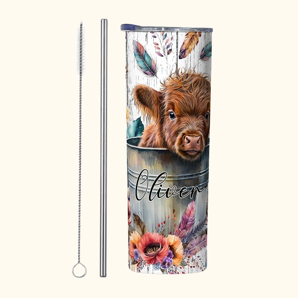 Onze skinny tumbler bedrukt een schattige baby highland koe in een emmer afbeelding met een aangepaste naam, waardoor het zich onderscheidt van gewone thermische tumblers en elke highland koe liefhebber versteld doet staan.