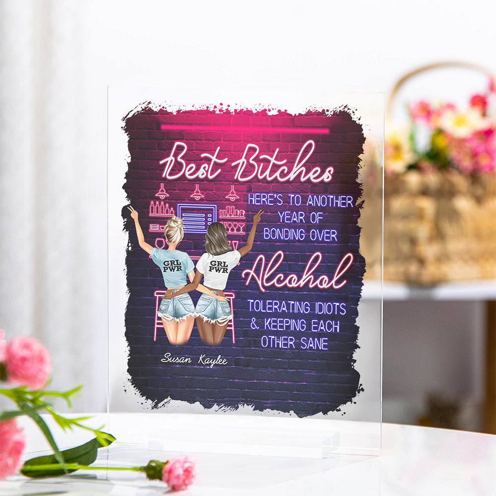 Het middelpunt van deze plaquette is de geestige en relateerbare boodschap: "BESTE WIJVEN OP NOG EEN JAAR SAMENZIJN MET ALCOHOL, IDIOTEN TOLEREREN EN ELKAAR GEZOND HOUDEN." Het geeft perfect de essentie weer van een echte vriendschap waarin beide partijen zich openlijk kunnen uiten en tegelijkertijd onwrikbare steun en begrip bieden. Deze humoristische zin laat de luchthartigheid en het plezier zien die jullie relatie kenmerken, waardoor het een fantastische gespreksstarter is wanneer gasten je huis of kantoor bezoeken.