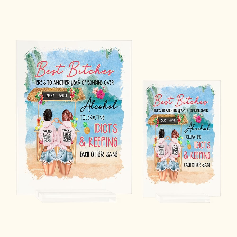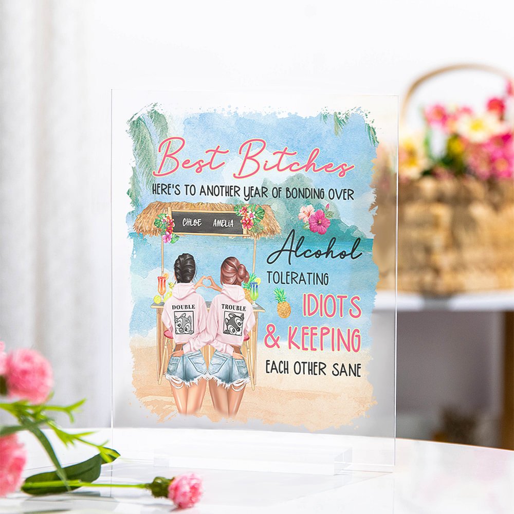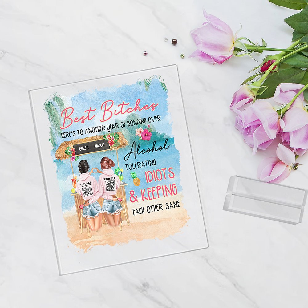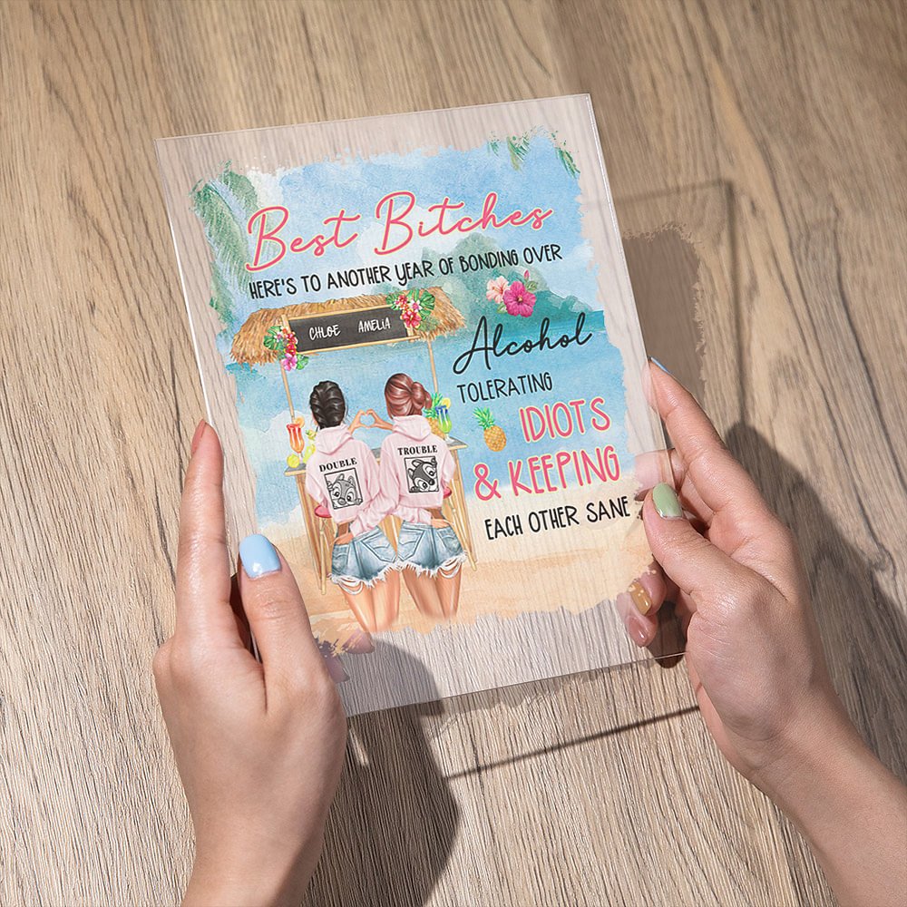 Het middelpunt van deze plaquette is de geestige en relateerbare boodschap: "BESTE WIJVEN OP NOG EEN JAAR SAMENZIJN MET ALCOHOL, IDIOTEN TOLEREREN EN ELKAAR GEZOND HOUDEN." Het geeft perfect de essentie weer van een echte vriendschap waarin beide partijen zich openlijk kunnen uiten en tegelijkertijd onwrikbare steun en begrip bieden. Deze humoristische zin laat de luchthartigheid en het plezier zien die jullie relatie kenmerken, waardoor het een fantastische gespreksstarter is wanneer gasten je huis of kantoor bezoeken.