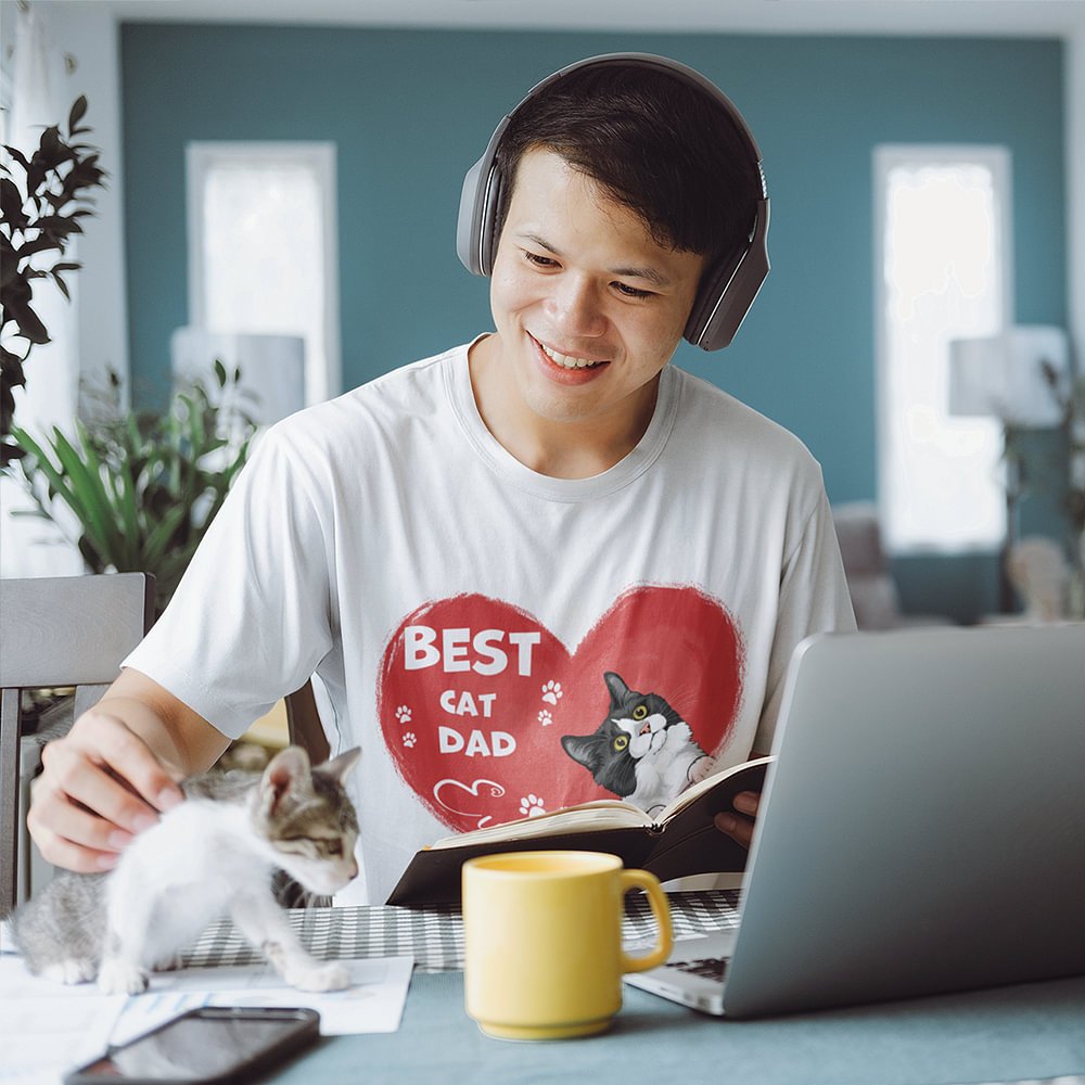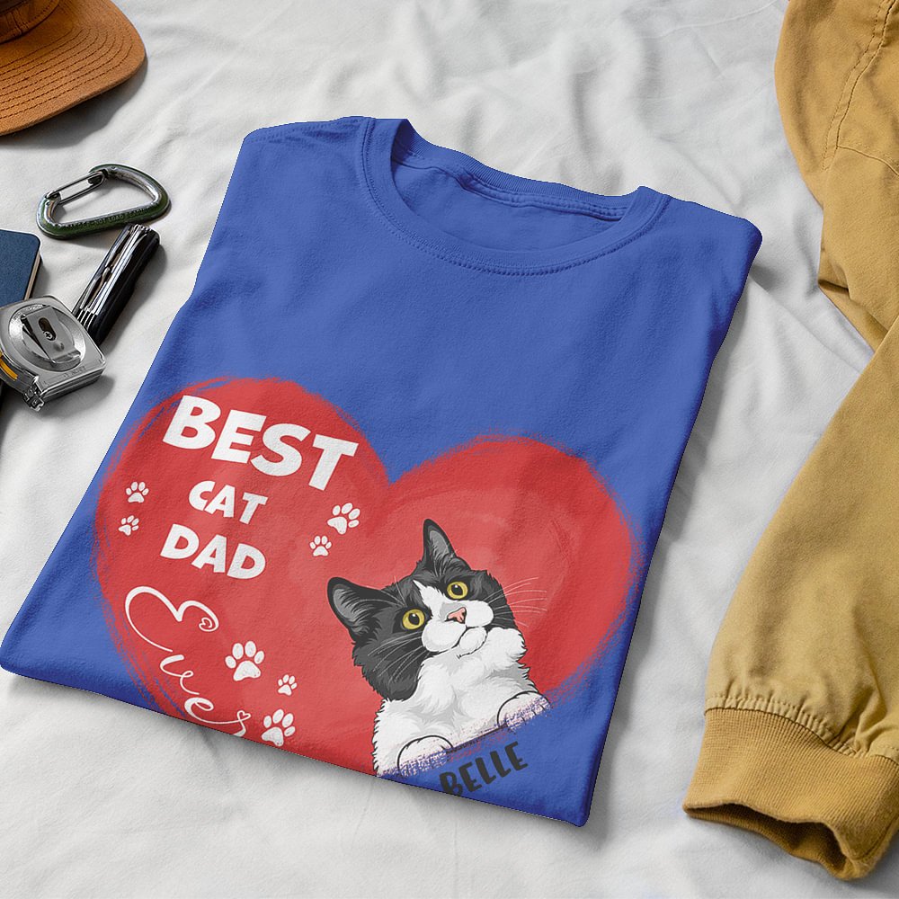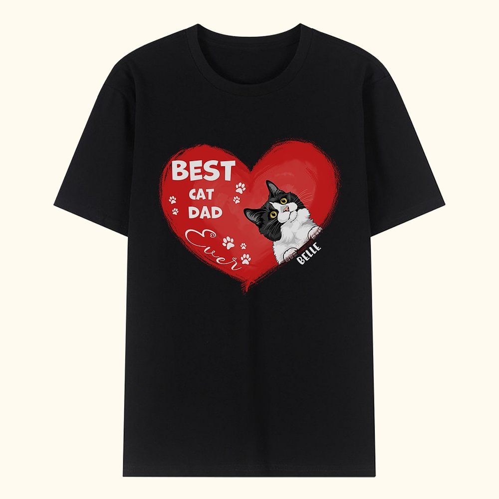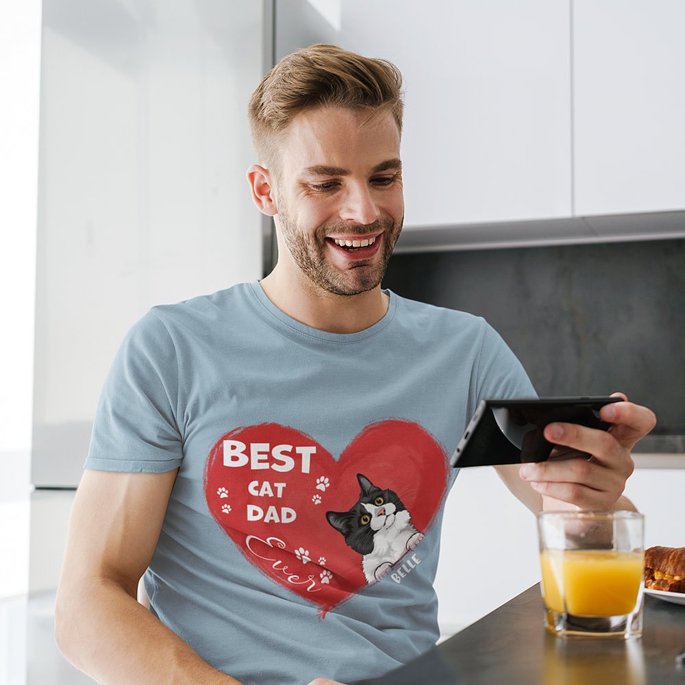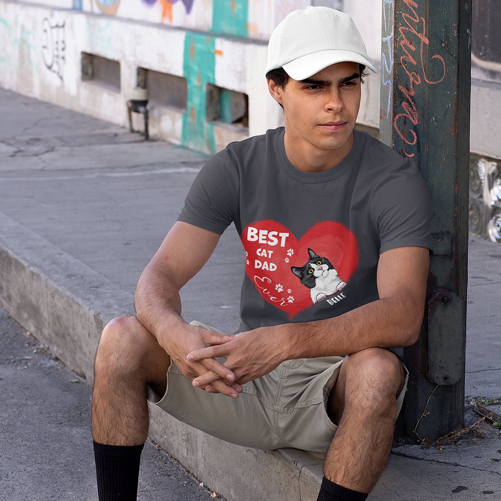 Dit t-shirt voor huisdieren is ontworpen als persoonlijk cadeau voor mensen met een grote liefde voor hun harige metgezellen. Op de voorkant van het t-shirt staat een rood hart en de zin "Best Cat Dad Ever", samen met een schattige afbeelding van een huisdier. Je kunt het ras van het huisdier kiezen en de naam aanpassen om je genegenheid voor je geliefde huisdier uit te drukken. Dit maakt het een perfect cadeau om speciale gelegenheden te herdenken of waardering te tonen tussen vrienden.