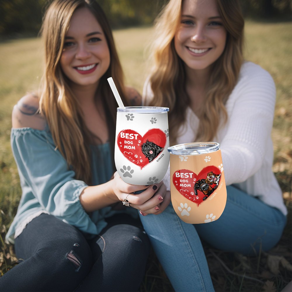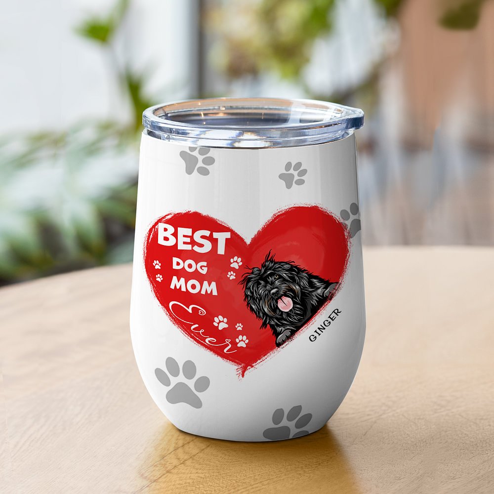De boodschap "Best Dog Mom Ever" is prachtig afgedrukt op de wijntuimelaar en staat voor de prachtige band tussen huisdieren en hun baasjes.