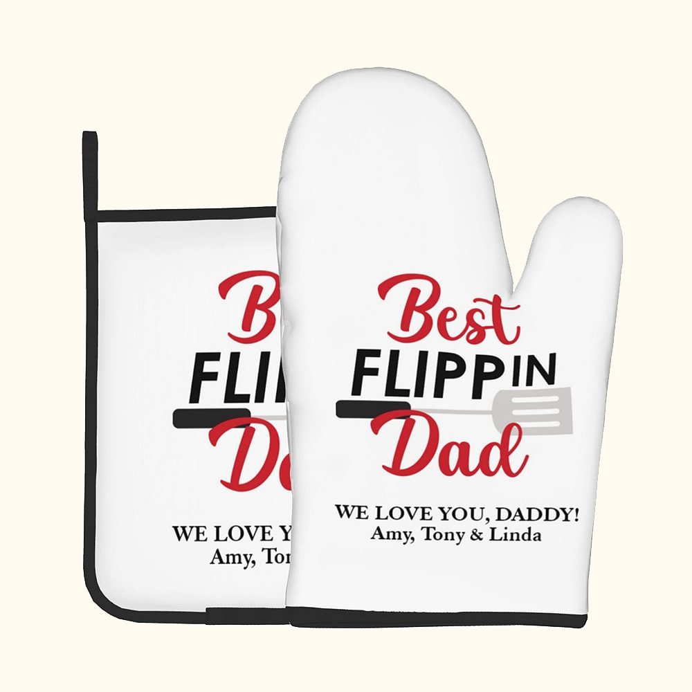 De woorden "Best Flippin Dad" en het spatelontwerp maken deze ovenwant en pannenlap interessanter, en de aangepaste tekst en naam voegen persoonlijke charme toe. De ovenwant en pannenlap zijn zo ontworpen dat ze passen bij de grootte van iemands hand. Het is gemakkelijker te gebruiken en blijft in de weg zitten.