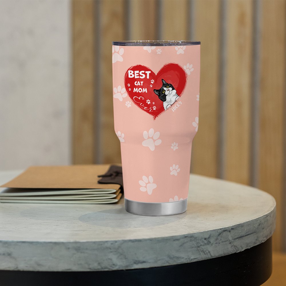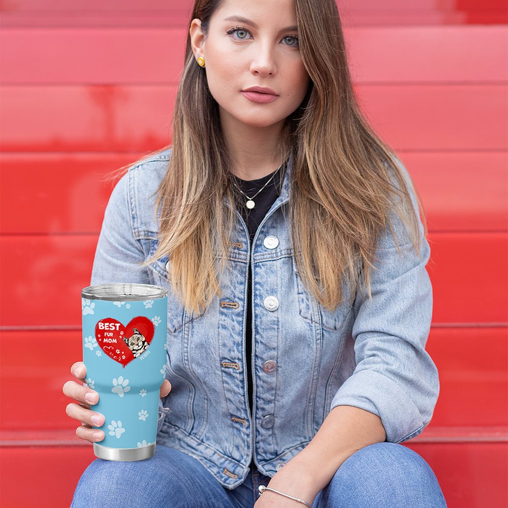 Op de beker staat de zin "BEST FUR/DOG/CAT MOM/DAD", vergezeld van een charmante cartoonafbeelding van een huisdier. De opvallende pootafdruk en het rode hartontwerp maken het een heerlijk cadeau voor dierenliefhebbers met gevoel voor humor.