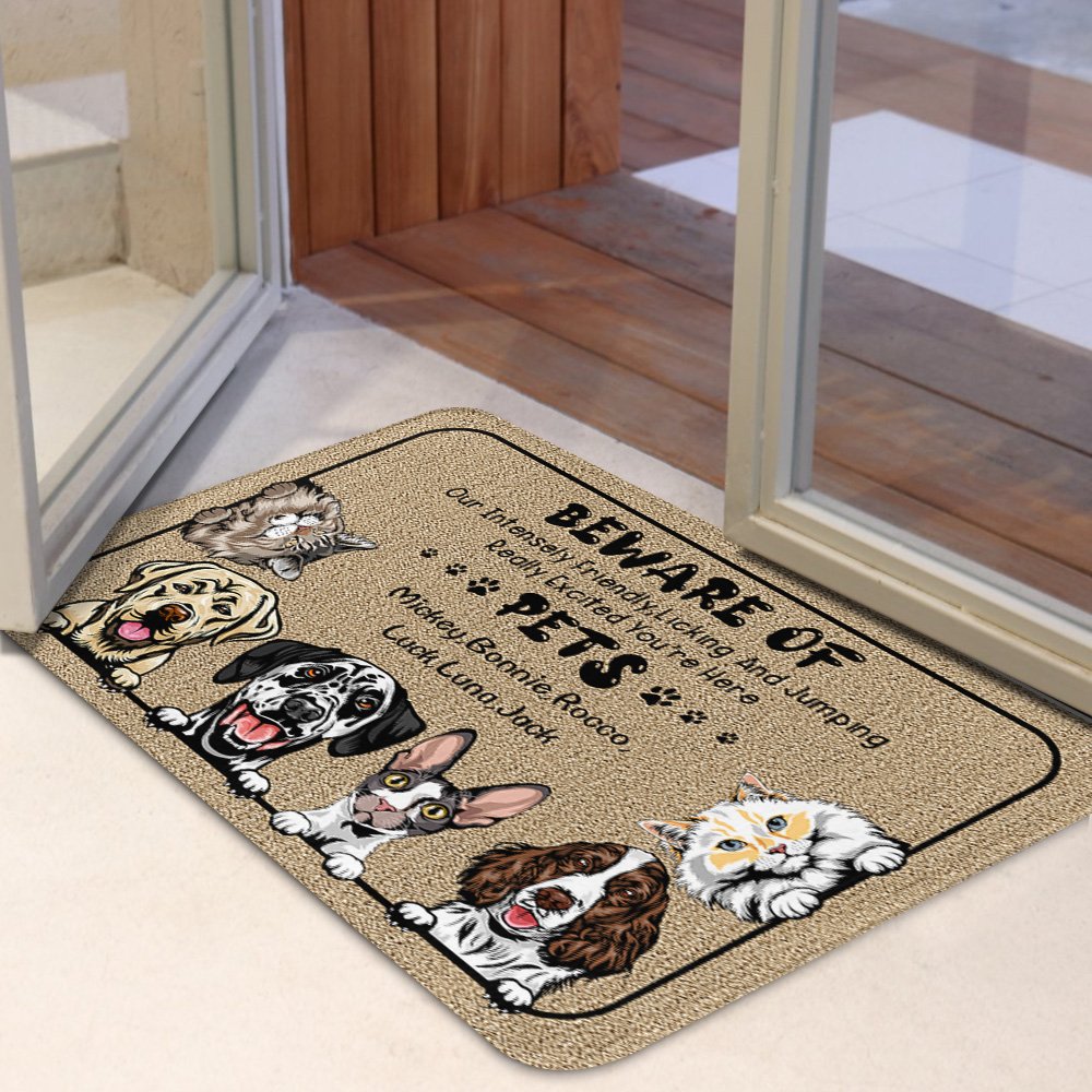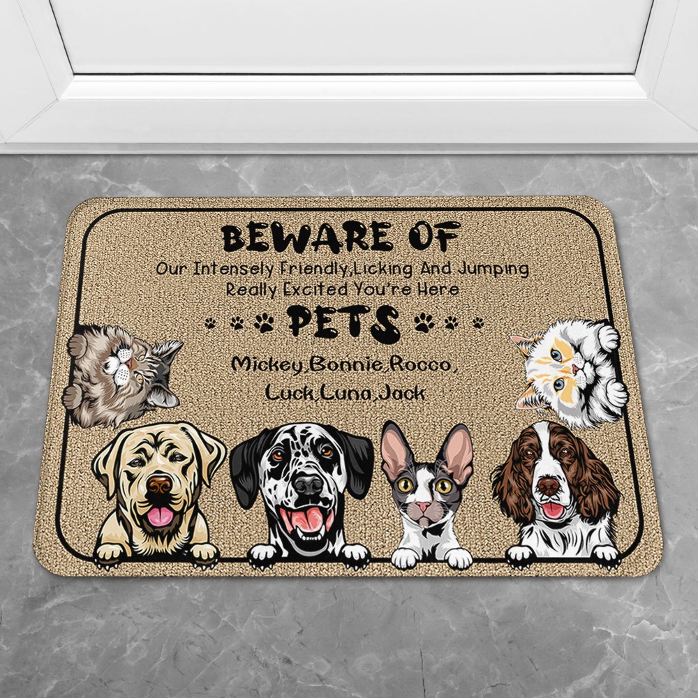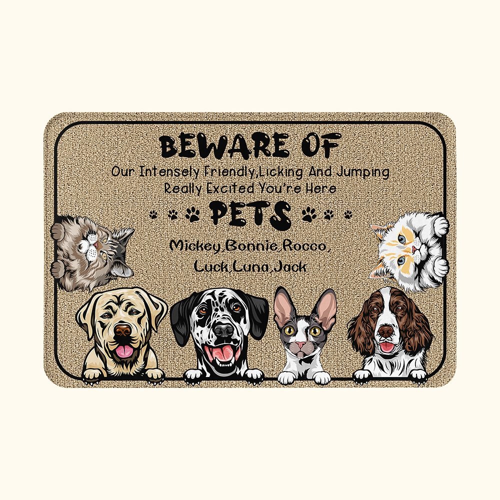 De zin "Beware Of Pets Our Intensely Friendly Really Excited You're Here" toont de humor en het plezier van huisdieren en hun baasjes. Print deze unieke zin op de mat met de exclusieve naam van je huisdier om de schattigheid van je huisdier en de liefde van de eigenaar voor je huisdier voor altijd te koesteren.
