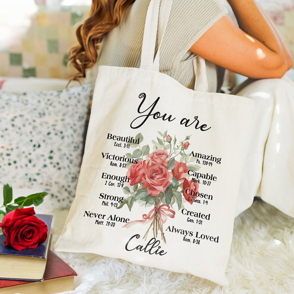 Vier geloof en schoonheid met onze prachtige canvas tas! De tas heeft een levendig boeketontwerp dat liefde, vreugde en geestelijke groei symboliseert. Elke bloem is zorgvuldig ontworpen om een mooi beeld te creëren dat de opbeurende bijbelverzen in het ontwerp aanvult. Je kunt de tas ook personaliseren met je naam, waardoor het een uniek en onmisbaar accessoire wordt voor gebed.