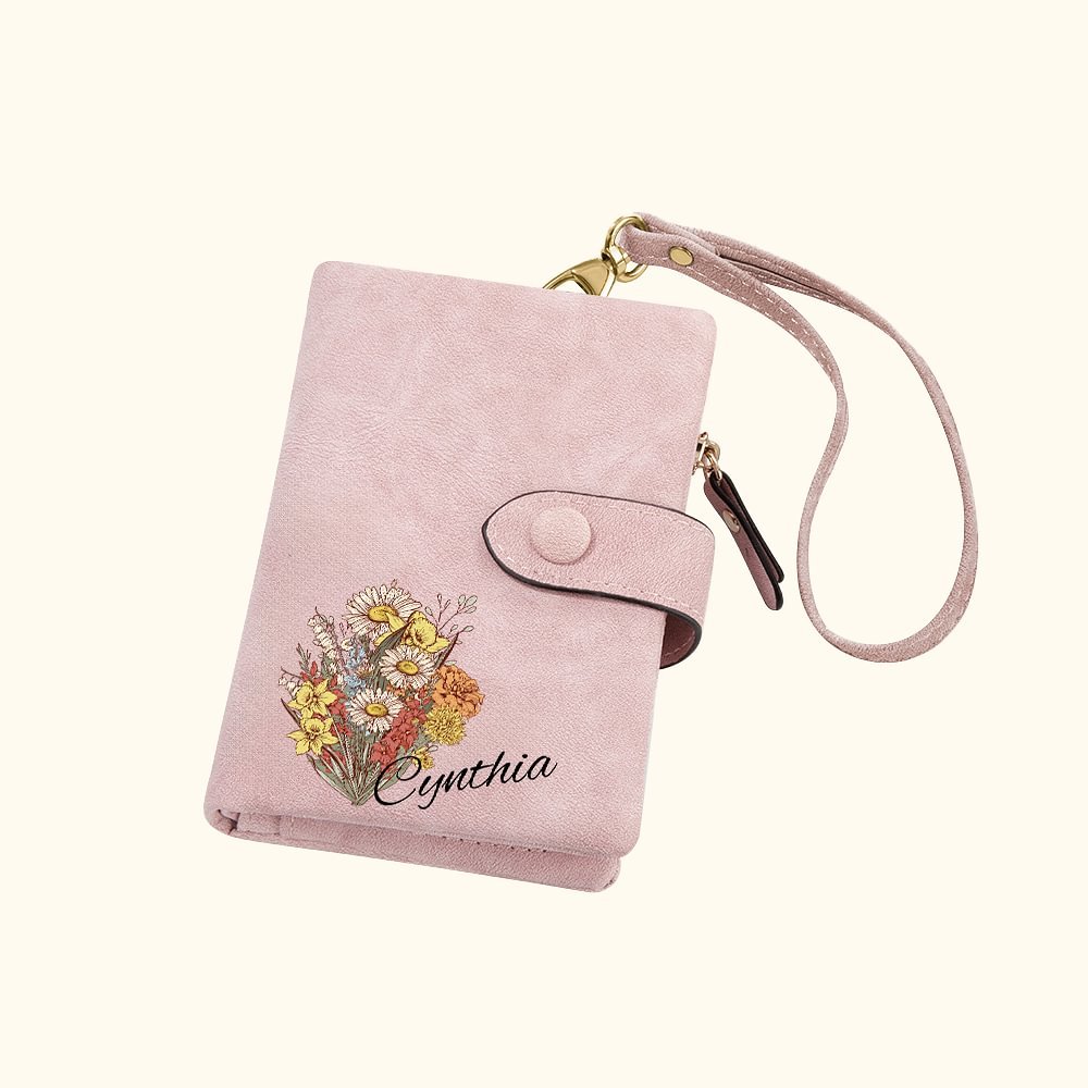 Deze portemonnee drukt een prachtig boeket geboortebloemen af. Elke bloem staat voor de geboortemaand van een kind en de onderkant kan worden aangepast met de naam van mama of oma, waardoor een uniek en betekenisvol boeket ontstaat dat liefde en bewondering voor moeders of oma's uitdrukt.