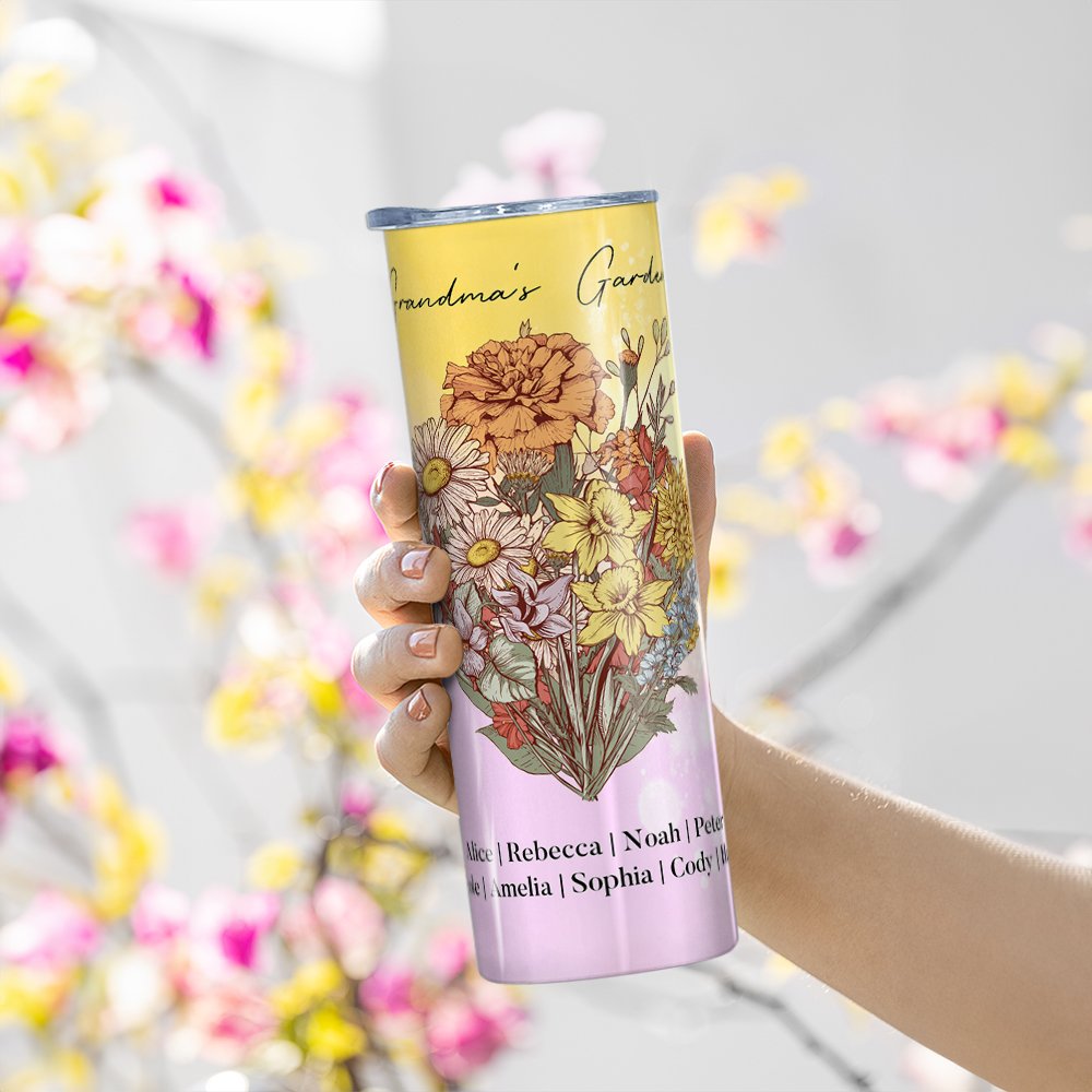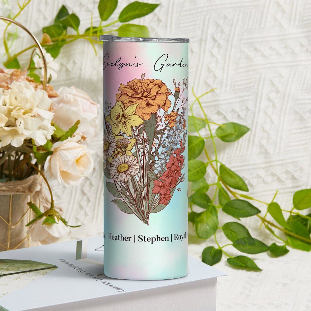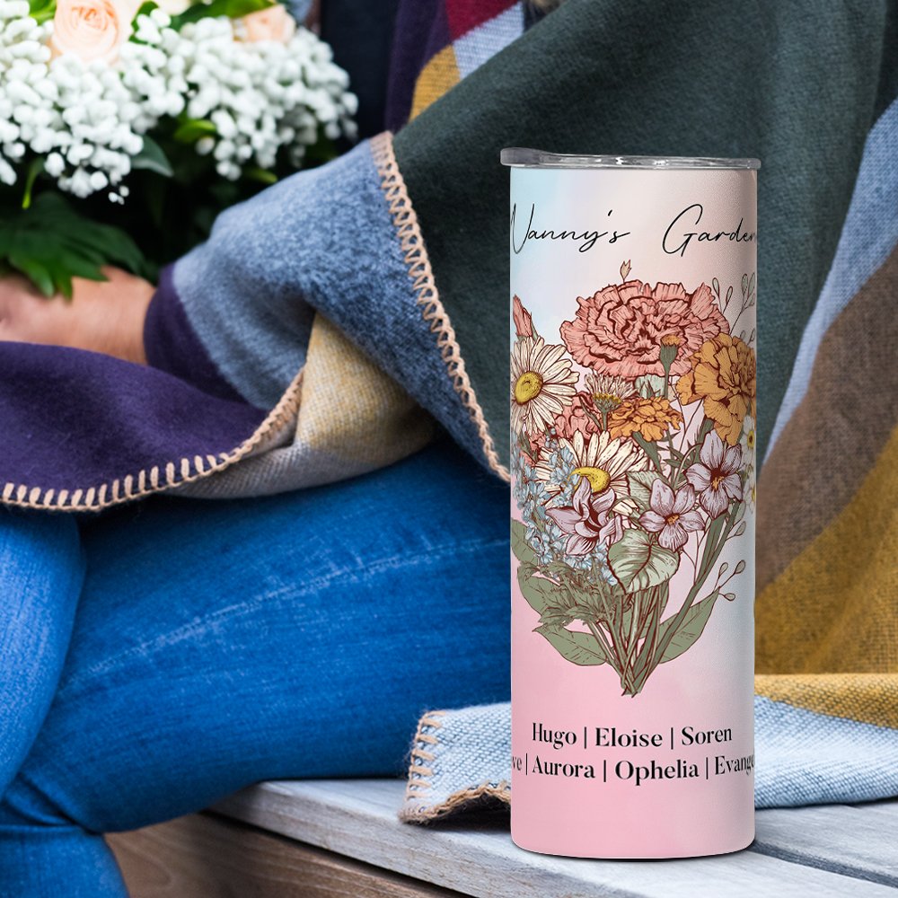 Deze beker is voorzien van een prachtig boeket geboortebloemen, elke bloem staat voor de geboortemaand van een kind en kan worden aangepast met hun namen, waardoor een uniek en betekenisvol boeket ontstaat dat liefde en bewondering voor moeders of grootmoeders uitdrukt.