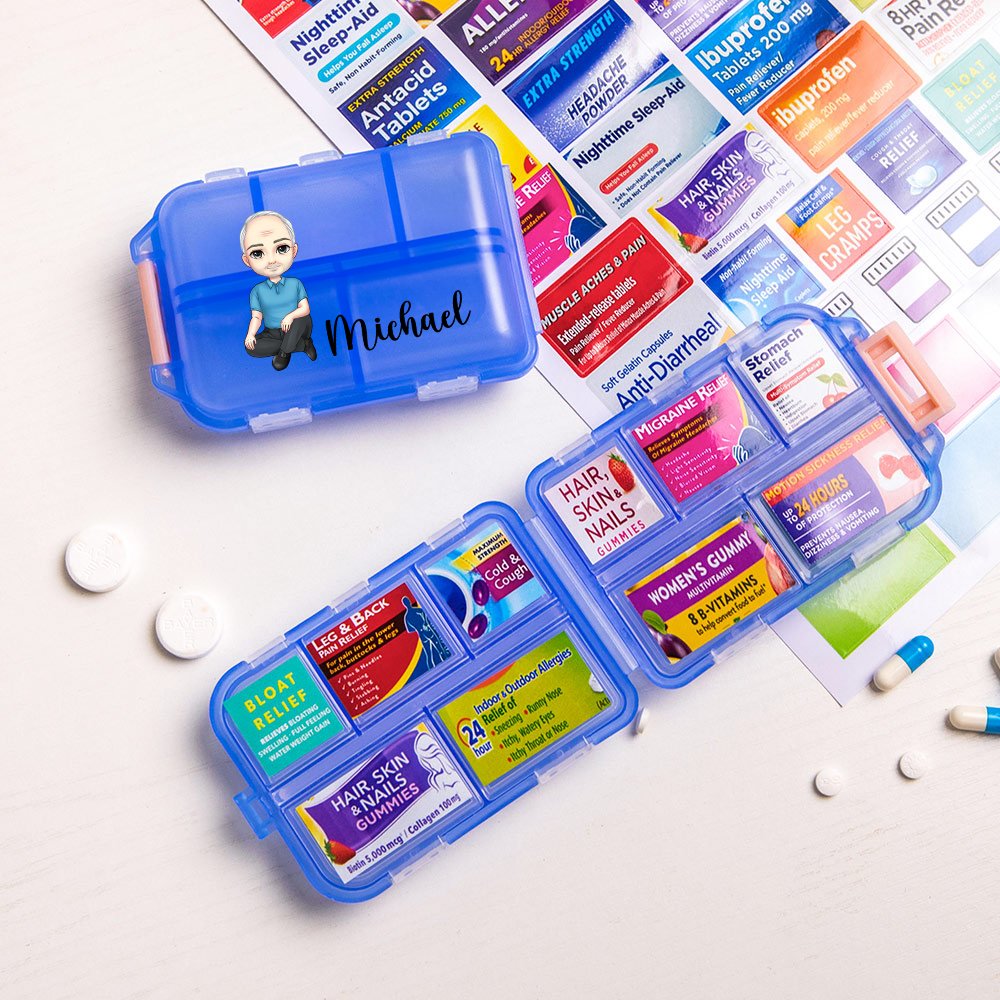 Deze medicijndoos combineert kunst en functionaliteit met een uniek ontwerp van geboortebloemen en stripfiguren, dat eenvoudig en creatief is. Elk medicijndoosje kan worden aangepast met een naam of een geboortebloem plus een naam naar wens van de gebruiker, waardoor het een exclusieve apotheek wordt. Je kunt stickers toevoegen om je medicijndoos nog opvallender te maken.
