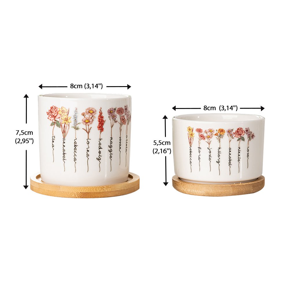 Deze bloempot van keramiek is een ideaal cadeau voor je moeder of oma. Op de voorkant van de bloempot staat een ontwerp van een geboortebloem en de kleurrijke bloemen staan voor verschillende maanden. Elke bloem kan worden gekoppeld aan een naam om een familielid of kind te symboliseren, waardoor elke bloempot uniek is.