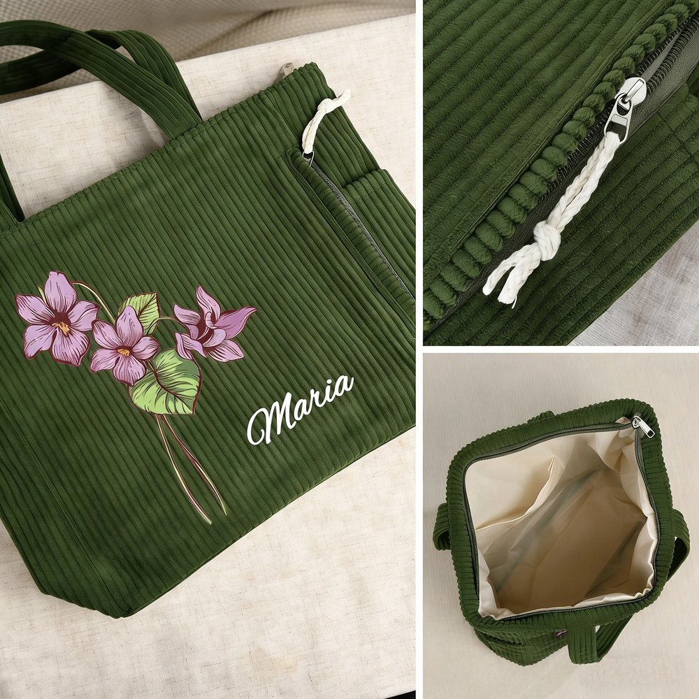 Dit ontwerp draait om een unieke geboortebloem en kan worden gepersonaliseerd met een naam. De zachte en elegante uitstraling geeft de tas een persoonlijke betekenis en sluit mooi aan bij een vrouwelijke stijl. De ribfluwelen stof zorgt voor een warme, vintage uitstraling en maakt van deze alledaagse tas een bijzonder accessoire met zowel emotionele waarde als een verfijnde uitstraling.