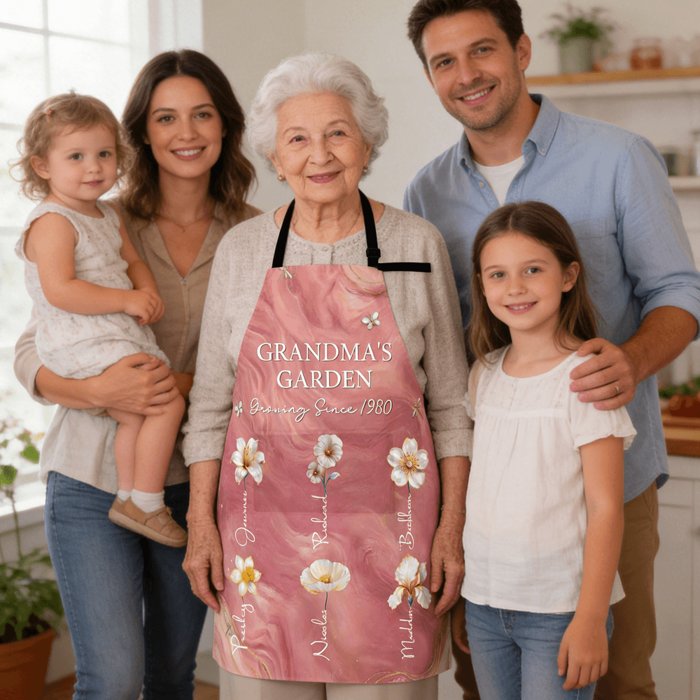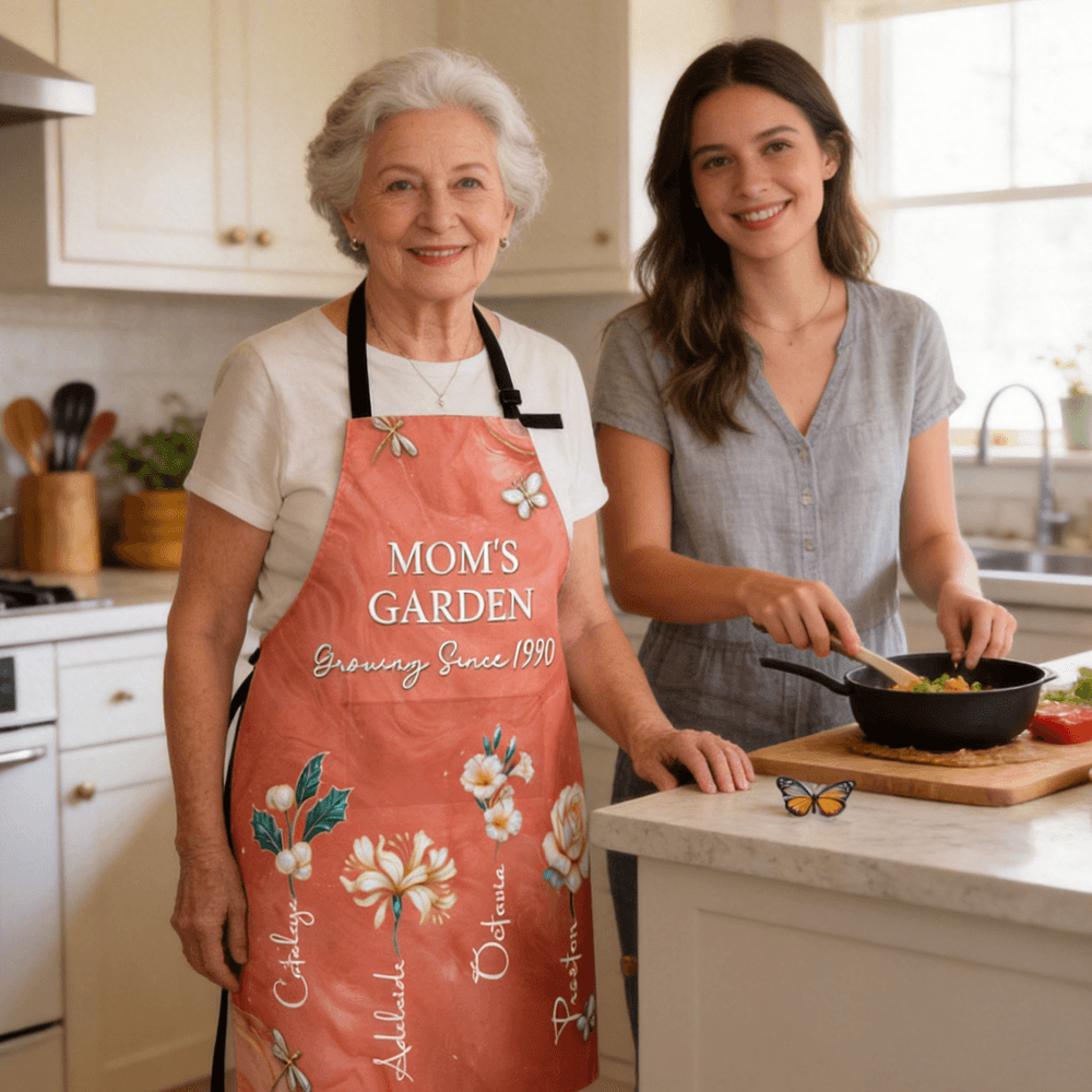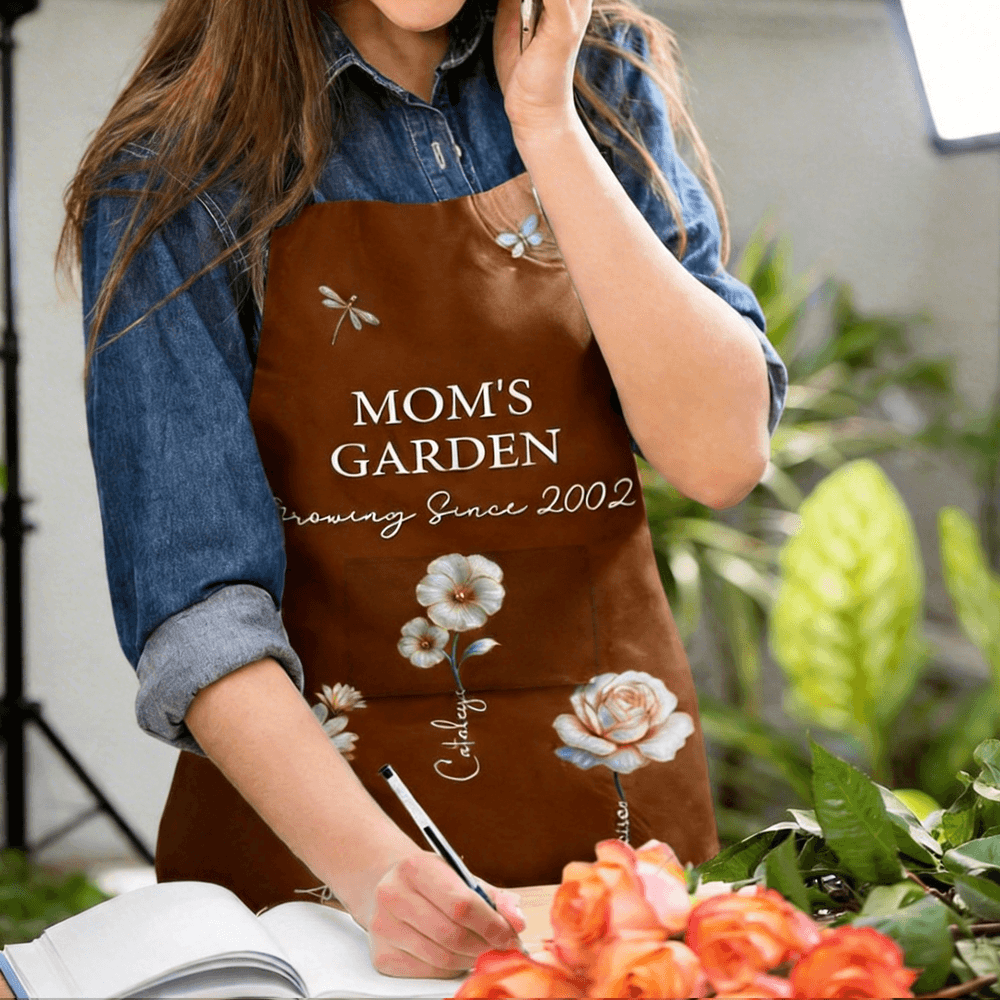 Dit schort, het ideale cadeau voor Moederdag, heeft 1-10 geboortebloemen op de voorkant van het schort, wat eenheid en schoonheid betekent. Je kunt geboortebloemen kiezen op basis van de geboortedata van verschillende familieleden en namen toevoegen met een aangepaste titel voor extra warmte.