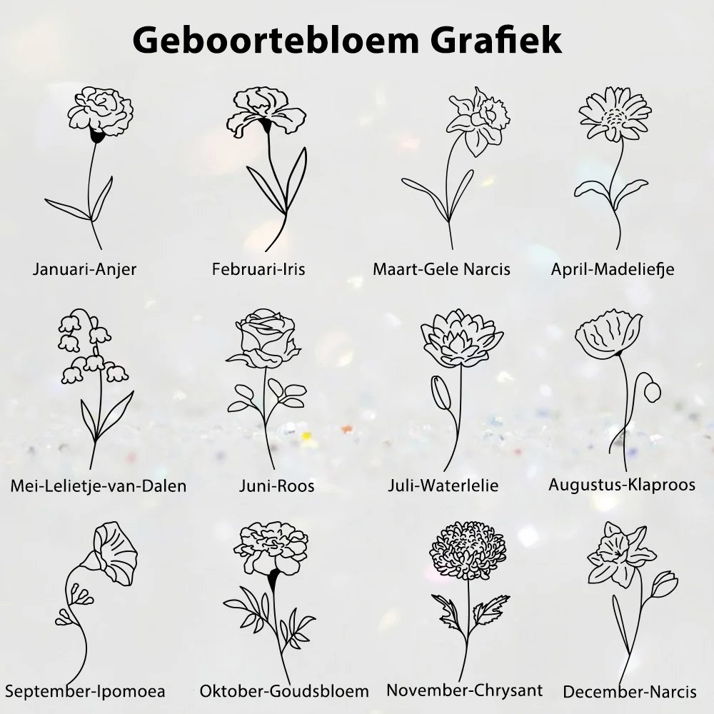 Geniet van de elegantie van deze ketting versierd met de geboortebloem van de ontvanger. Het ingewikkelde ontwerp toont de schoonheid en symboliek van de specifieke bloem die verbonden is met de geboortemaand van de ontvanger. Dit betekenisvolle detail voegt niet alleen een prachtige esthetiek toe, maar bevat ook de essentie van de geboortemaand van de ontvanger, waardoor het een kostbaar aandenken wordt.