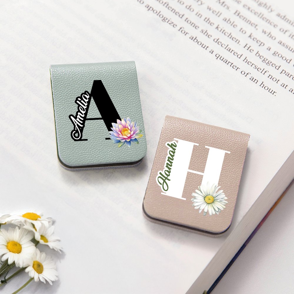 Het combineert verfijnde lederen textuur met delicate bloemen en typografisch ontwerp. De grote initialen, persoonlijke namen en geboortebloemen creëren een elegante, persoonlijke stijl die zowel een functioneel leeshulpmiddel als een stijlvol accessoire voor boekenliefhebbers is.