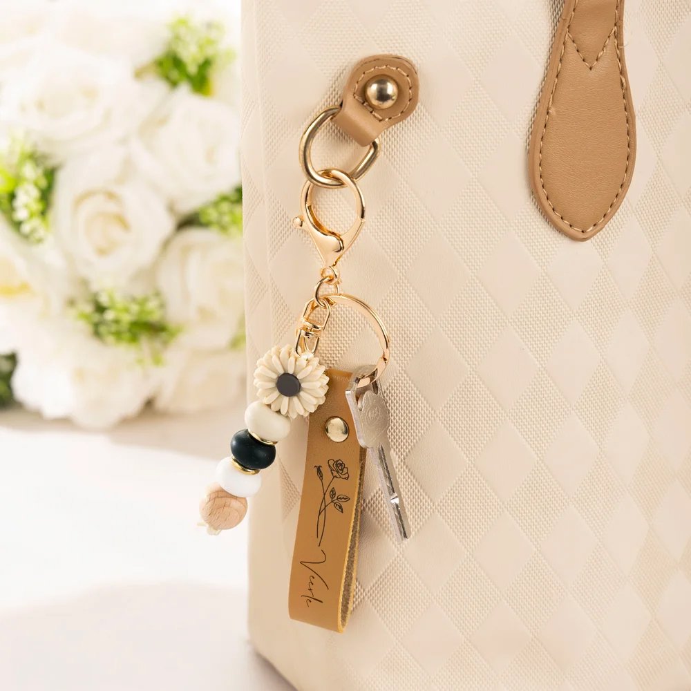 De sleutelhanger is gemaakt van duurzaam PU-leer, waardoor hij lang meegaat en bestand is tegen dagelijks gebruik. De siliconen margrietbedel is stevig en slijtvast, en behoudt zijn heldere kleuren, ook bij dagelijks gebruik. Elk onderdeel is met zorg gemaakt, en de gepolijste afwerking maakt de sleutelhanger nog mooier.