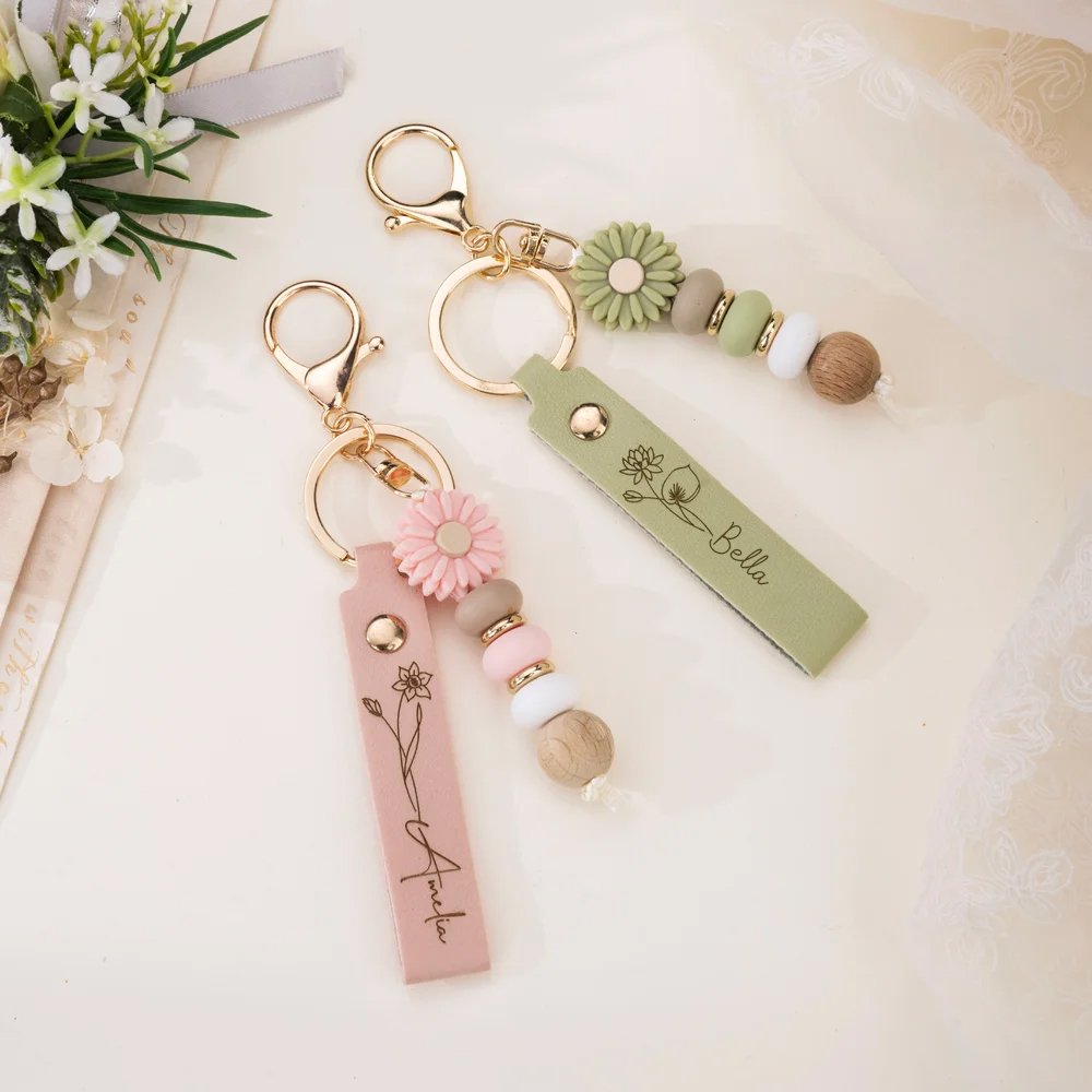 Deze charmante sleutelhanger heeft een prachtig ontwerp met een geboortebloem en een persoonlijke naam, en is voorzien van een madeliefjesbedel die een vrolijk accent toevoegt. De delicate madeliefjesbedel is gemaakt van siliconen, waardoor hij er zacht en speels uitziet. Elk sleutelhanger is uniek gemaakt, zodat je je persoonlijkheid kunt laten zien tijdens een speciale gelegenheid.