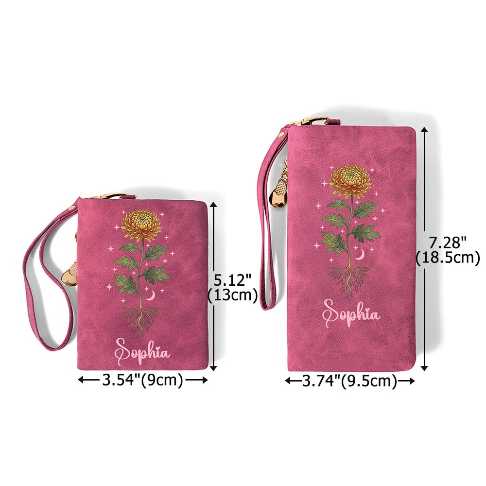 Deze gebloemde damesportemonnee combineert natuurlijke elegantie met personalisatie. Op elke portemonnee staat een delicate geboortebloem, geaccentueerd met vlinders, sterren en manen. Aanpasbaar met een naam. Verkrijgbaar in een lange (meer opbergruimte) en korte (compact en licht) stijl - perfect voor woon-werkverkeer of een dagje winkelen.