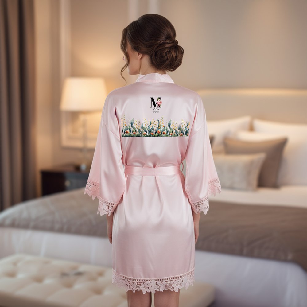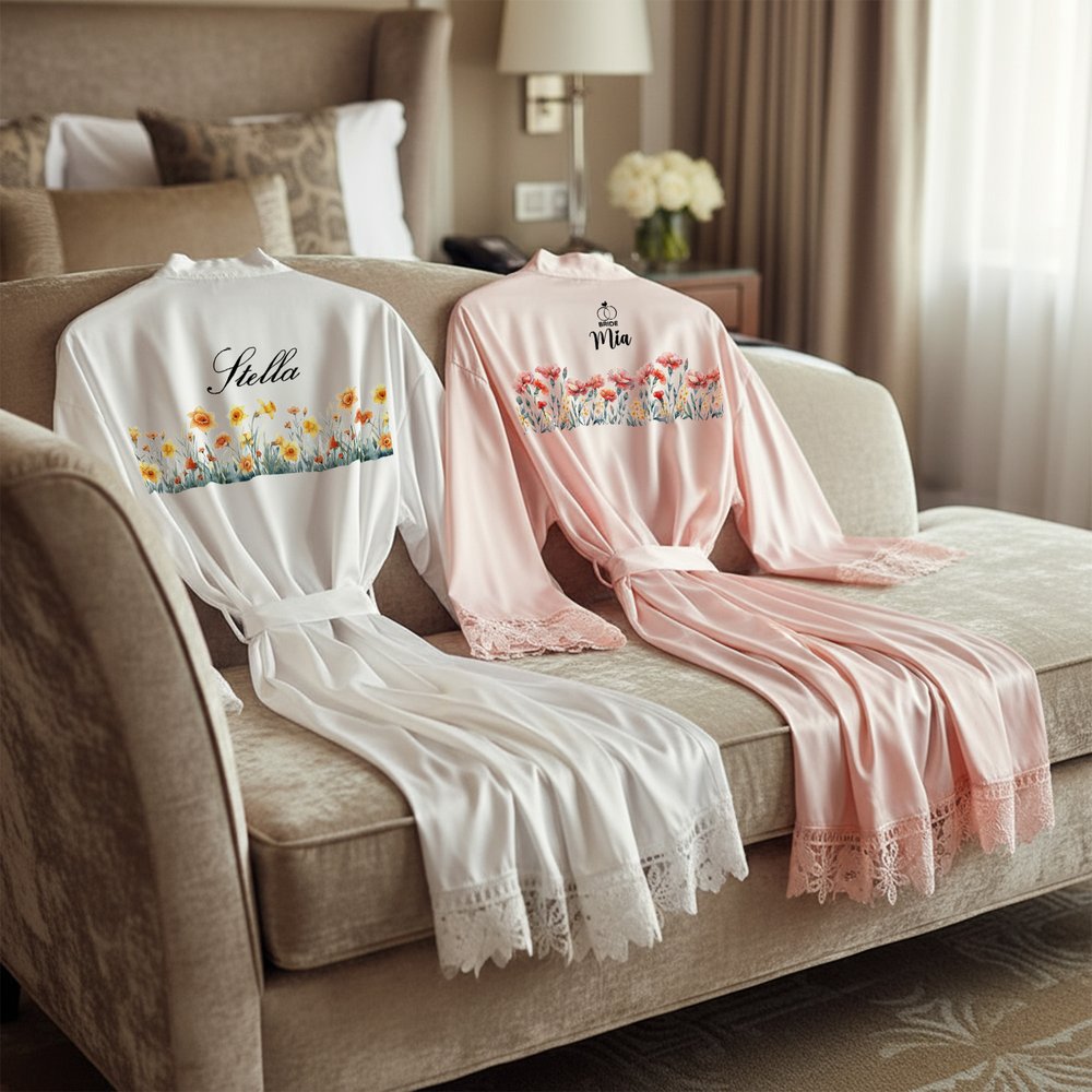 Deze gepersonaliseerde damesjurk draait om delicate geboortebloemen en aanpasbare elementen zoals namen, data of initialen, waarbij een selectie van elegante letterstijlen beschikbaar is. De badjas is afgewerkt met fijn kant en combineert kunstig klassieke satijnen glans met romantische details om elke draagster een gevoel van persoonlijke ceremonie en blijvende betekenis te geven.