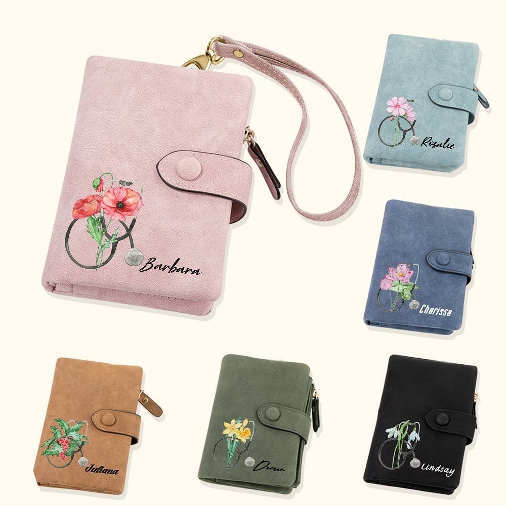 Deze portemonnee heeft een origineel en uniek ontwerp dat een geboortebloem en een stethoscoop combineert in een subtiele mix van elegantie en professionaliteit. Je kunt hem personaliseren met ons unieke lettertype, een naam toevoegen en er je eigen portemonnee van maken.