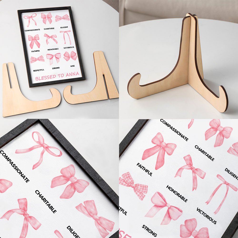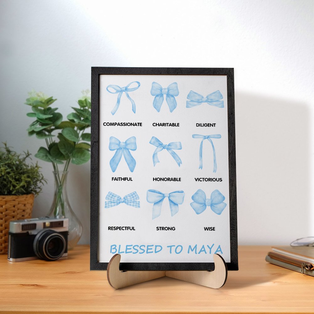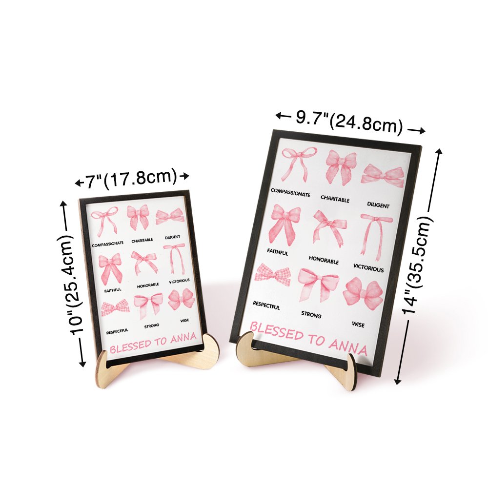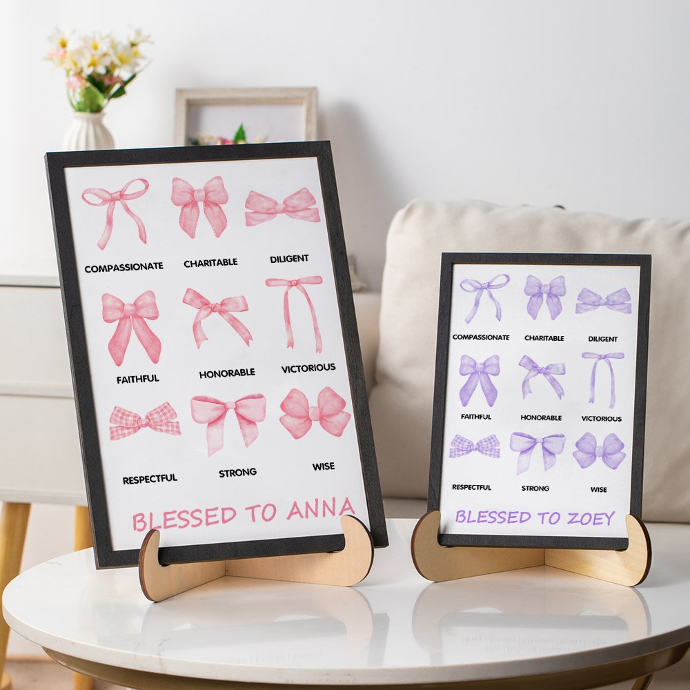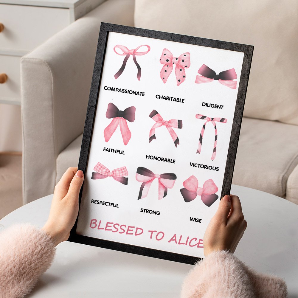 Het "Coquette strik" ontwerp voegt een speels en modieus tintje toe aan deze lijst. Onder elke strik staat een bijbelse zegening, ze zijn niet alleen decoratief maar kunnen de ontvanger ook bemoedigen. Met de aanpasbare tekst kun je je zegeningen aan de ontvanger overbrengen.