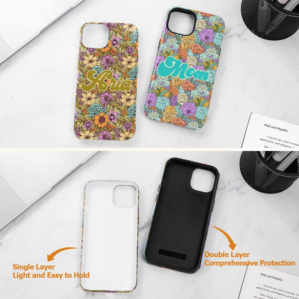 Dit telefoonhoesje heeft een patroon in bohemian-stijl en vintage bloemen, en zit vol artistieke sfeer, waardoor het een romantisch en warm gevoel geeft. Het telefoonhoesje kan worden aangepast met je naam om je esthetiek te laten zien en tegelijkertijd een leuke manier om je telefoon weer te geven.