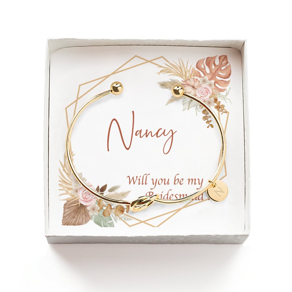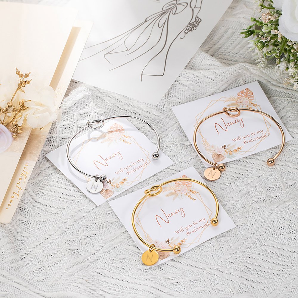 Deze prachtige bruidsmeisjesarmband combineert de trendy Boheemse stijl. De ronde schijfbedel en het knoopontwerp voegen een uniek en opvallend element toe aan de armband, en je kunt hem aanpassen met initialen en de naam van het bruidsmeisje, waardoor het een betekenisvol cadeau wordt dat je bruidsmeisjes voor altijd zullen koesteren.