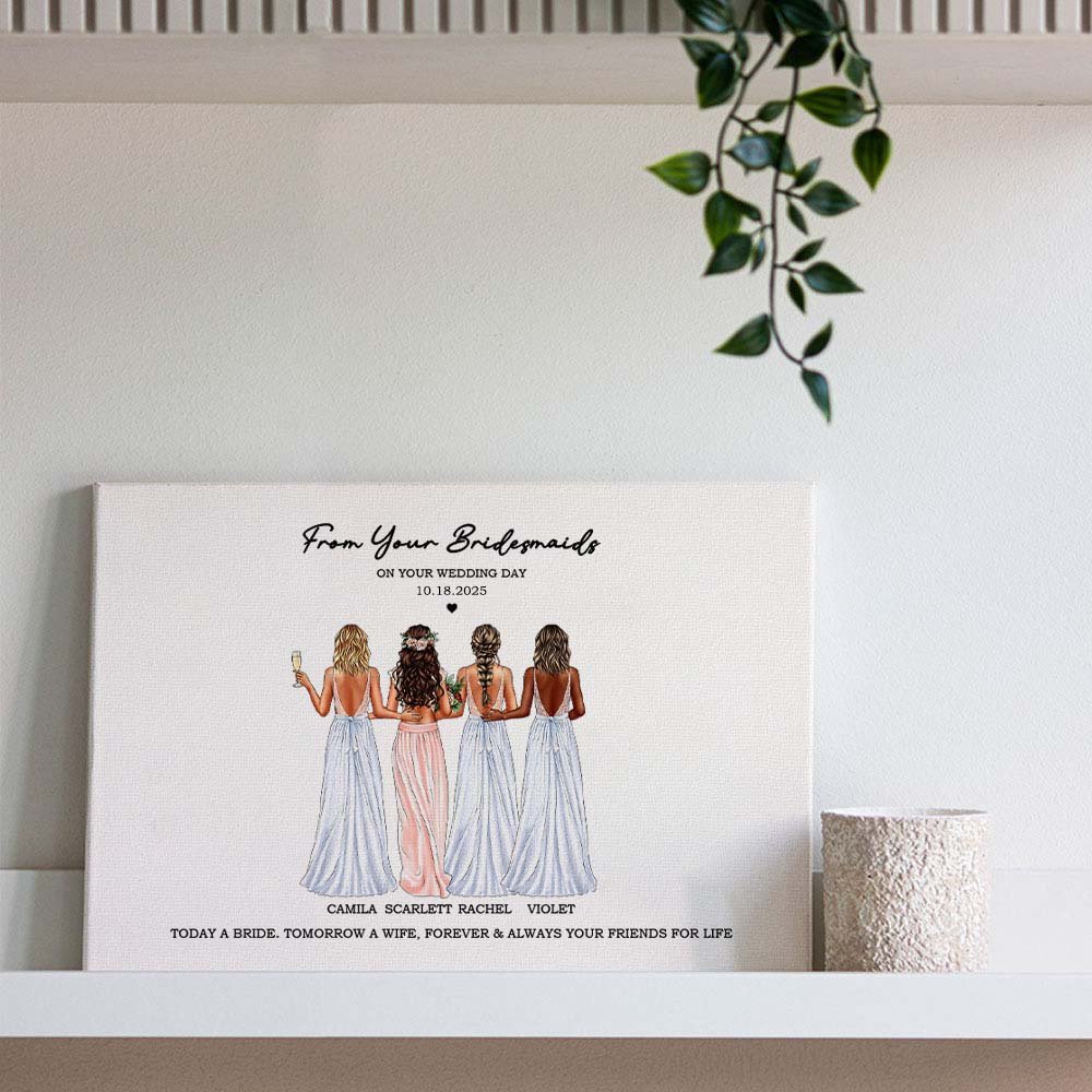 Zodra je het schilderij ziet, word je meteen aangetrokken door de unieke charme en elegantie. Het schilderij toont de mooie bruid omringd door haar mooie bruidsmeisjes, die allemaal een feestelijke toost uitbrengen. De toevoeging van de namen van de bruid en het bruidsmeisje, de trouwdatum en het hartverwarmende zegeningscitaat zorgt voor een echt persoonlijk en gedenkwaardig stuk.