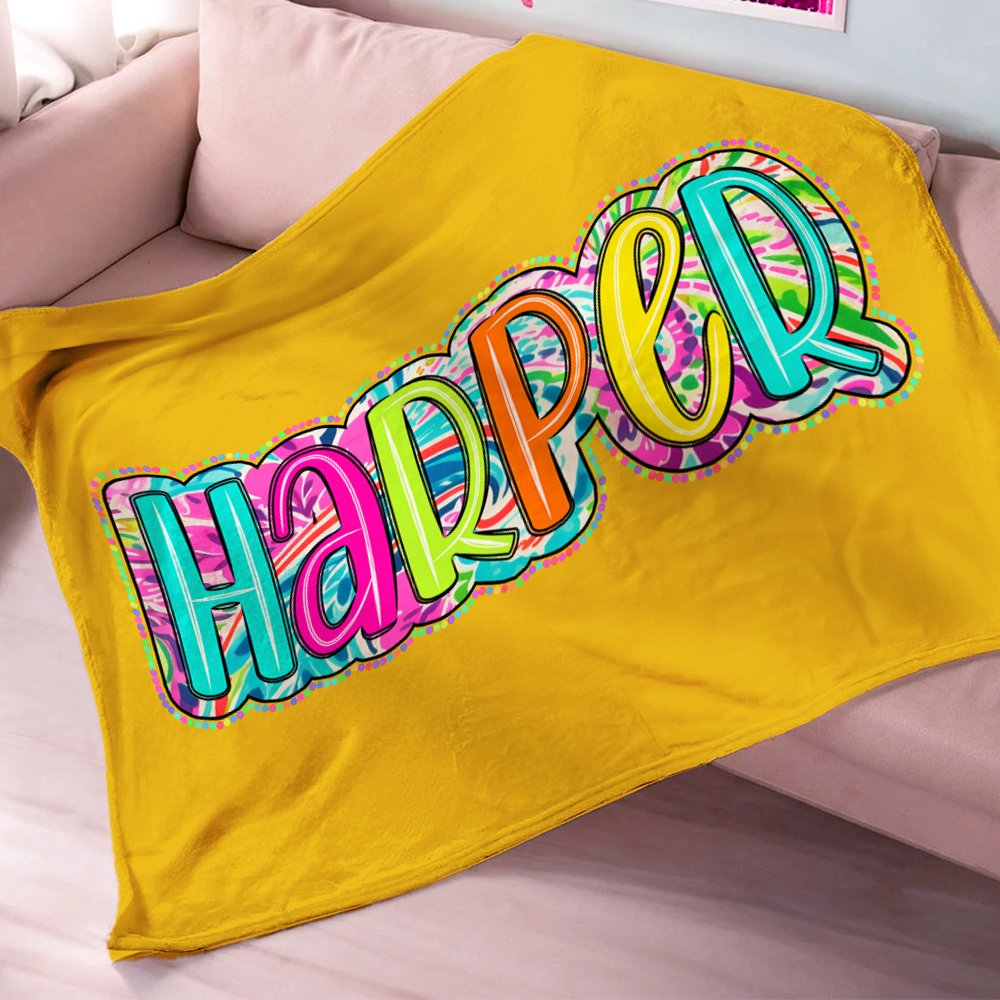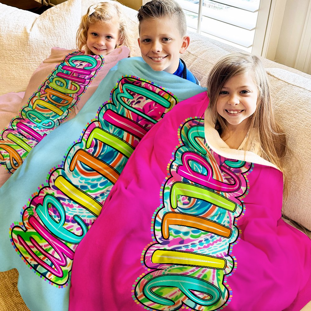 Het paisleypatroon is gedetailleerd en gemengd met felle kleuren zoals roze, blauw, groen en geel, waardoor de deken opvalt. Het kleurrijke bloemenpatroon en de gepersonaliseerde naam geven deze dekens een unieke en vrolijke uitstraling.