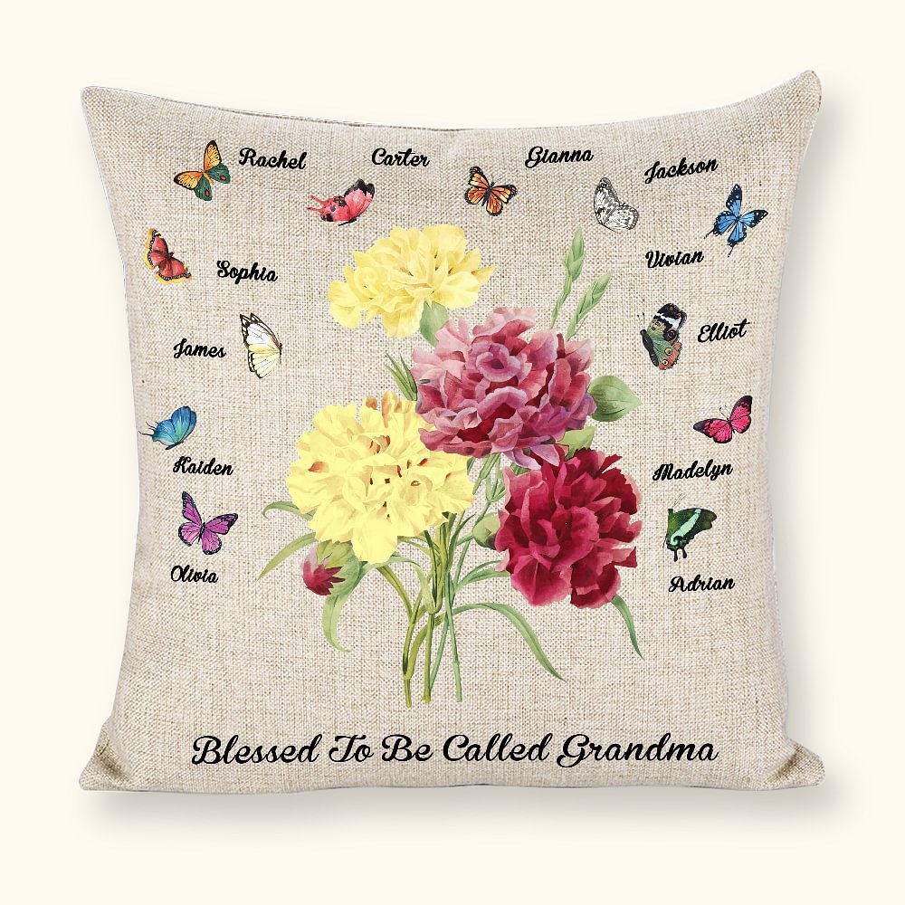 The ideal gift for Mother's Day, this pillow cover is adorned with a bouquet of carnations surrounded by butterflies for a beautiful message. You can choose the number of butterflies, add a name and the recipient's title, and the bottom of the pillow cover has a thoughtful phrase "Blessed to be called", adding more warmth.