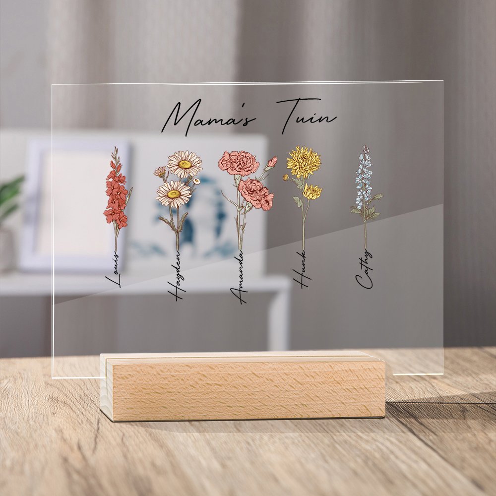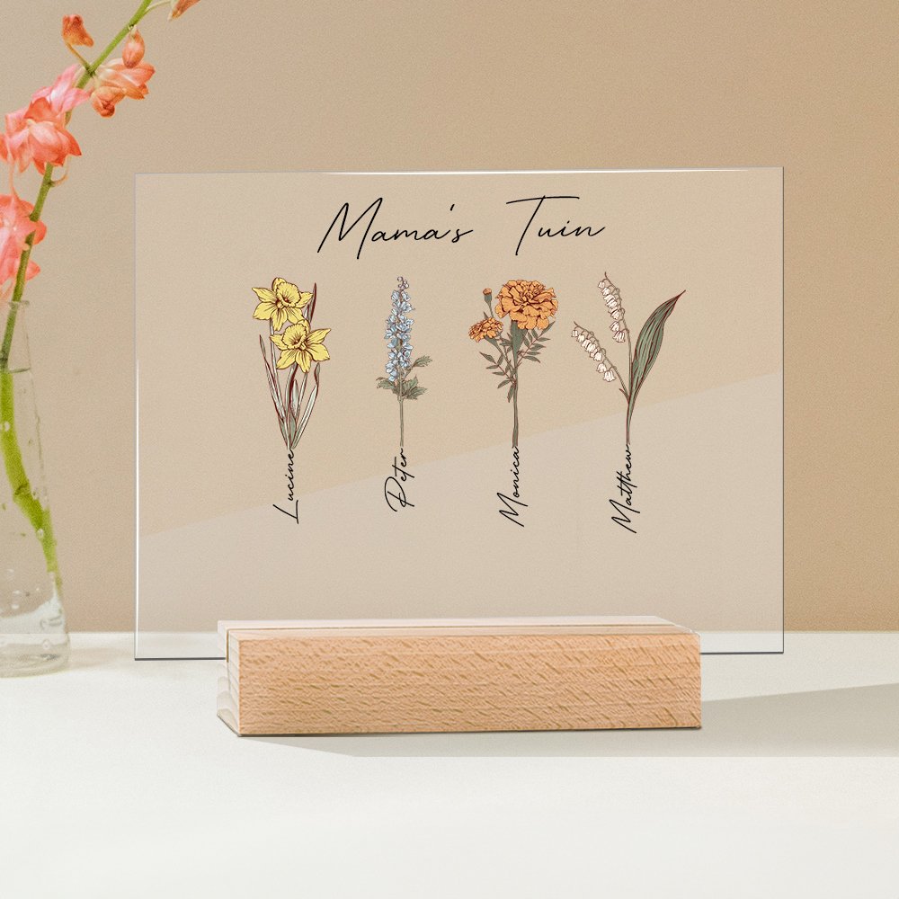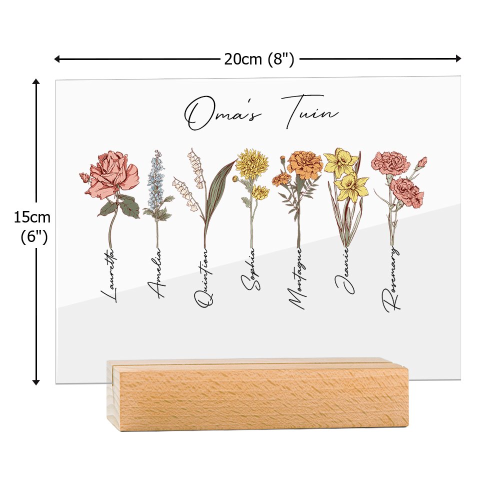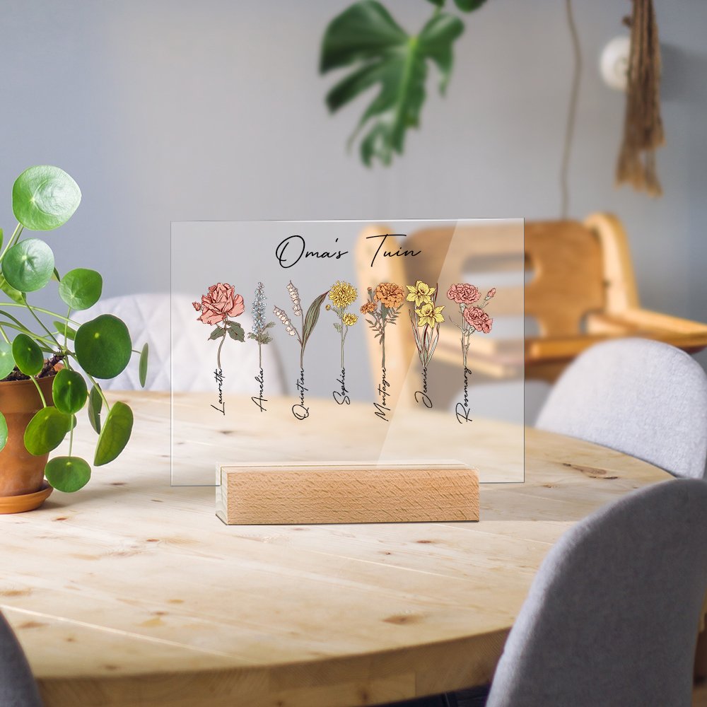 Op het acryl geboortegrondje kun je de titel en 1-20 verschillende geboortebloemen en namen personaliseren. Elke bloem staat voor de geboortemaand van een familielid, waardoor het echt een uniek en speciaal cadeau is.