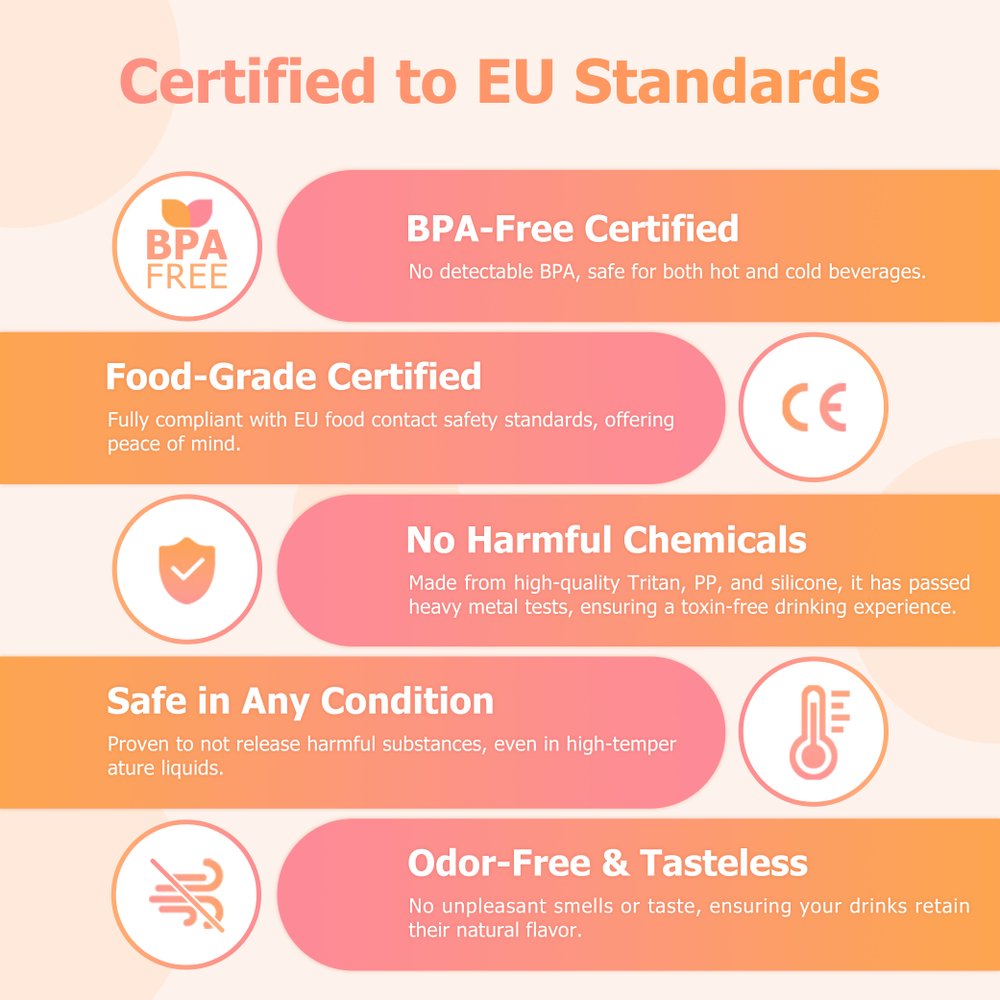 Gemaakt van voedselveilig, vriendelijk plastic, vrij van schadelijke chemicaliën zoals BPA, dus veilig voor kinderen. Met het zachte siliconen rietje kun je kleine slokjes nemen. Het ontwerp met brede mond zorgt voor snelle hydratatie en houdt het schoon. Het lekvrije ontwerp, in combinatie met een veiligheidsdop, voorkomt vloeistoflekkage en het stevige handvat biedt een comfortabele grip voor kleine handjes.