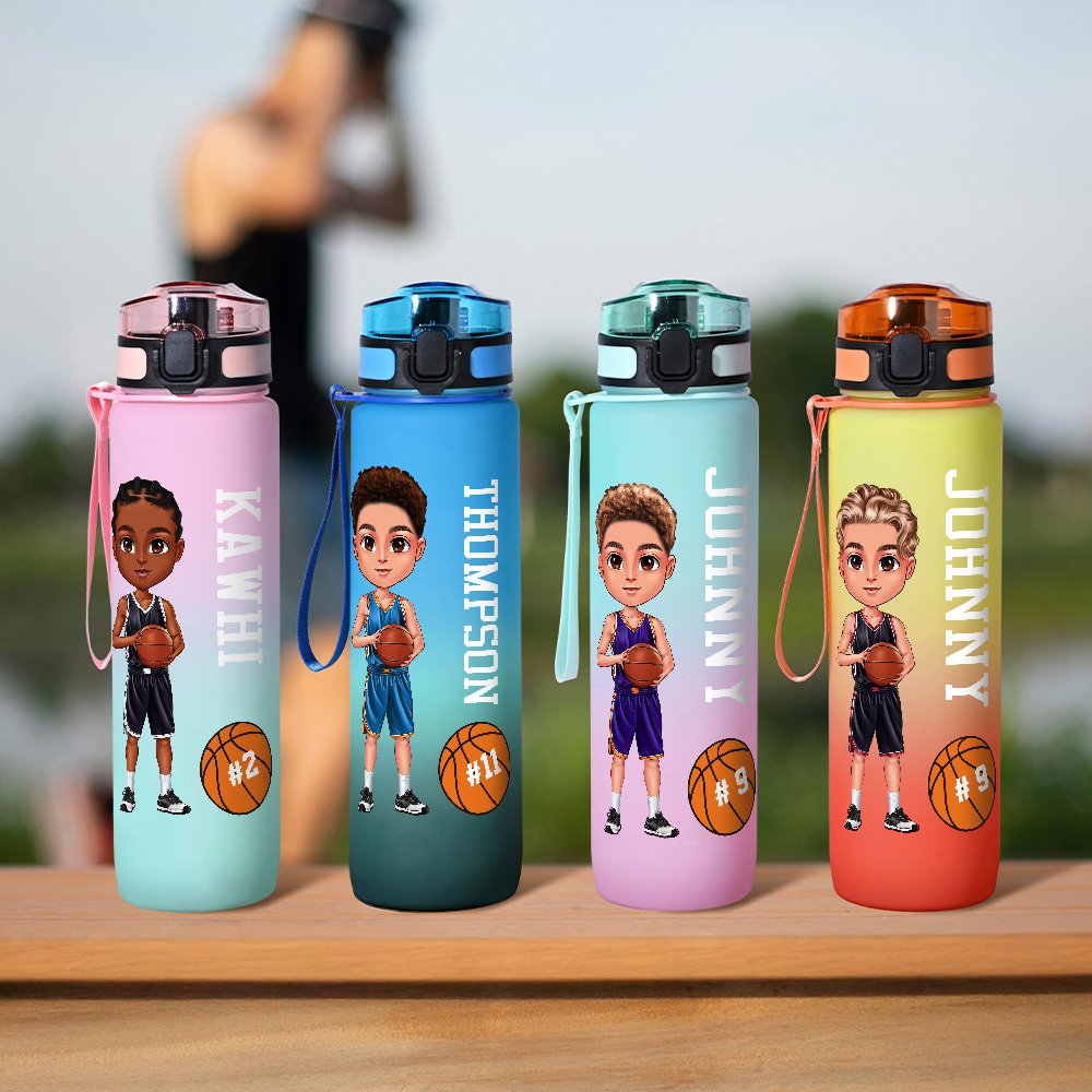 Deze gepersonaliseerde waterfles met kleurverloop van cartoonbasketbaljongen is ontworpen voor basketbalfanaten en -fans en maakt je drinkbeker uniek. Je kunt de afbeelding van je favoriete basketbaltekenfilmfiguur aanpassen, je favoriete kleurverloop kiezen en je naam en nummer toevoegen. Elk detail is vol exclusiviteit.