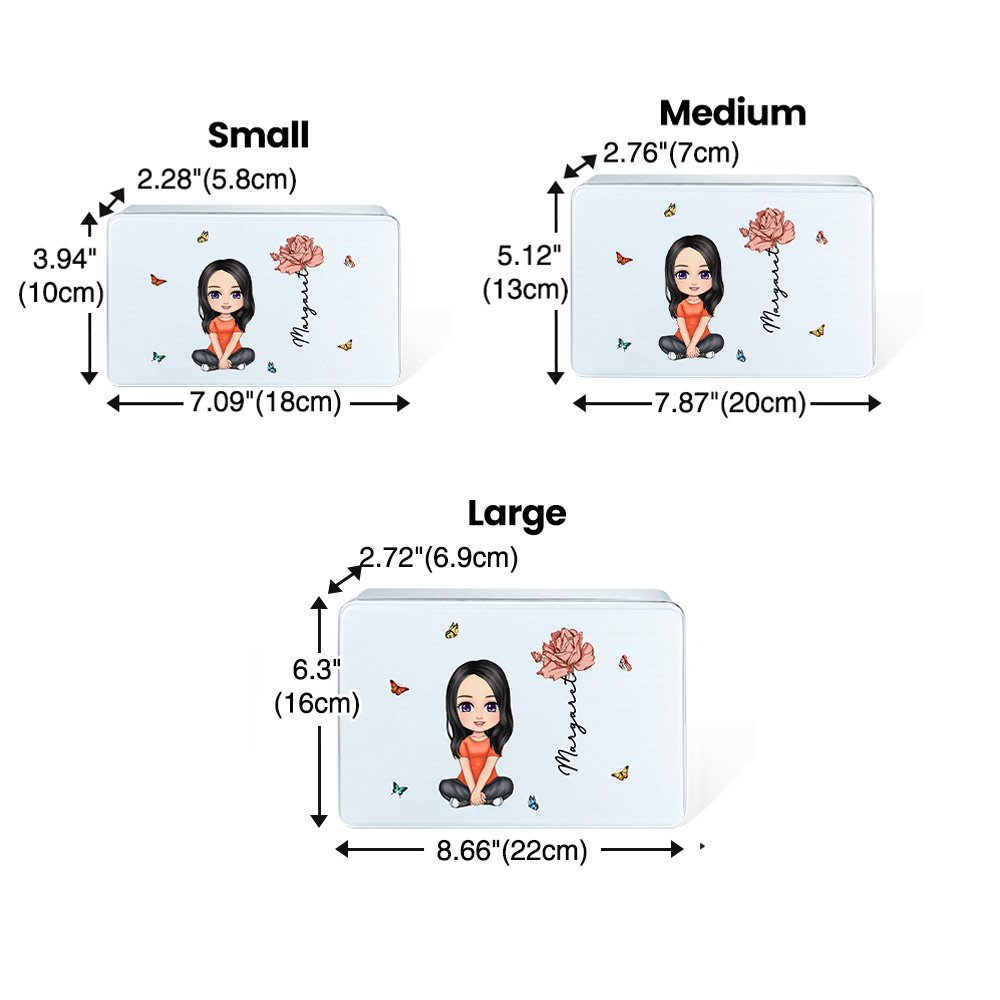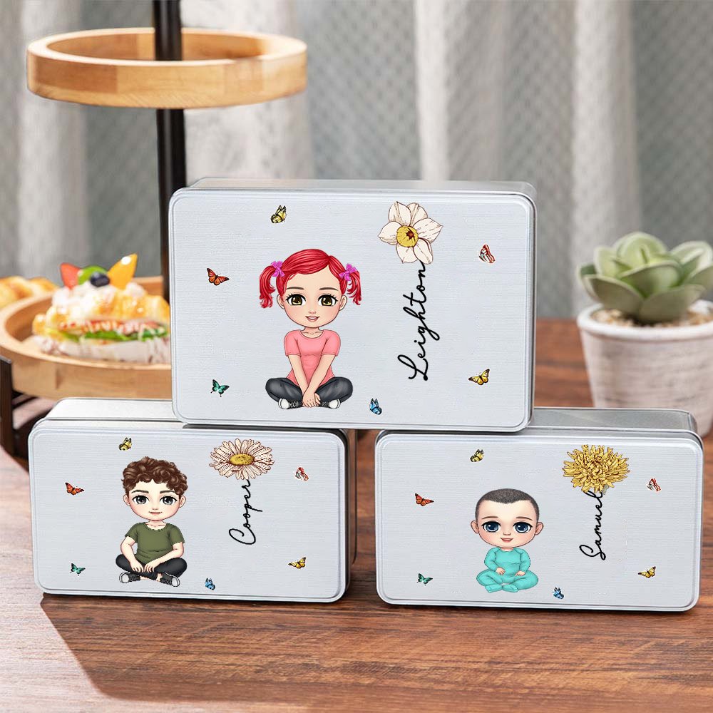 Deze blikken zijn voorzien van schattige stripfiguren op de deksels, met 6 karakters om uit te kiezen, geschikt voor verschillende leeftijden en geslachten. Je kunt de stripfiguren van jezelf of je familie en vrienden aanpassen en bloemen en namen toevoegen die overeenkomen met hun verjaardagen om er een dierbaar aandenken van te maken.