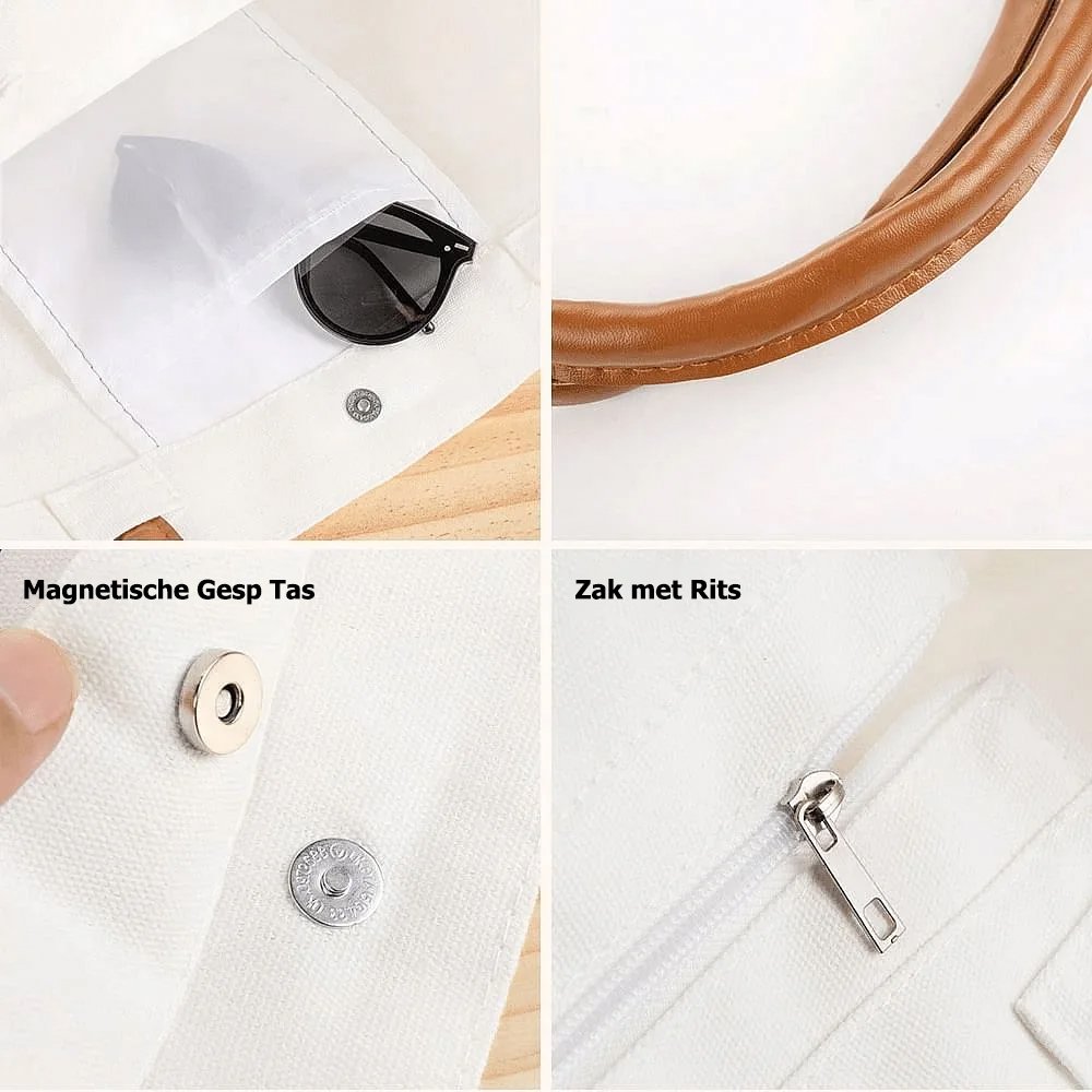 Deze handtas is gemaakt van eersteklas canvas en voelt zacht aan, maar is duurzaam genoeg voor dagelijks gebruik. Hij heeft een stevig leren handvat en een voering voor kleine spullen. Hij heeft ook een dubbel ontwerp van knopen en ritsen, waardoor hij handig is voor dagelijks gebruik.