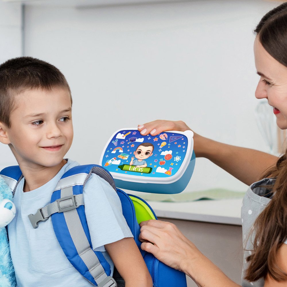 Deze lunchtrommel is voorzien van stripfiguren en andere elementen zoals regenbogen, sterren en raketten, die de verbeelding en creativiteit van kinderen stimuleren. Dankzij de duidelijke kleuren en aantrekkelijke ontwerpen wordt lunchen voor kinderen prettig en overzichtelijk. Bovendien kan elke lunchtrommel worden gepersonaliseerd met de naam van uw kind, waardoor de lunchtijd nog persoonlijker en plezieriger wordt.