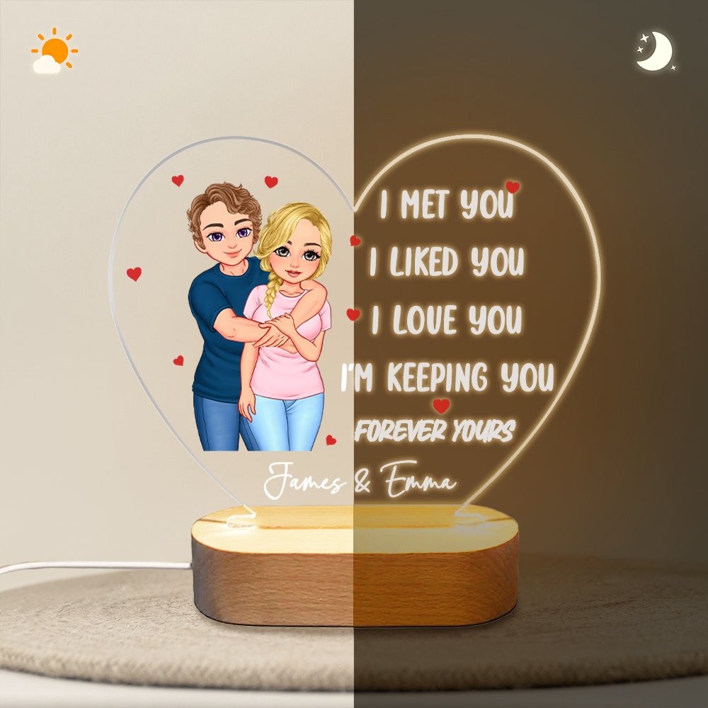 Het nachtlampje verbeeldt de hartstochtelijke omhelzing van een stel. De twee mensen op het schilderij omhelzen elkaar stevig, wat mensen een warm gevoel geeft. De persoonlijke naam en romantische tekst op het nachtlampje voegen emotionele diepte toe, waardoor dit nachtlampje niet alleen een decoratie is, maar ook een symbool van liefde.